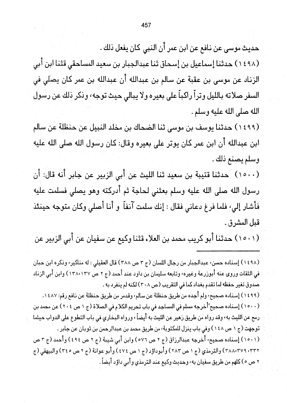 [1500] إِسْنَاده صَحِيح، أخرجه مُسلم فِي الْمَسَاجِد فِي بَاب تَحْرِيم الْكَلَام فِي الصَّلَاة (ج1 ص204) عَن مُحَمَّد بن رمح عَن اللَّيْث بِهِ، وَقد رَوَاهُ من طَرِيق زُهَيْر عَن اللَّيْث بِهِ أَيْضا، وَرَوَاهُ البُخَارِيّ فِي بَاب التَّطَوُّع على الدَّوَابّ حَيْثُمَا تَوَجَّهت (ج1 ص148) وَفِي بَاب ينزل للمكتوبة، من طَرِيق مُحَمَّد بن عبد الرَّحْمَن بن ثَوْبَان عَن جَابر.
