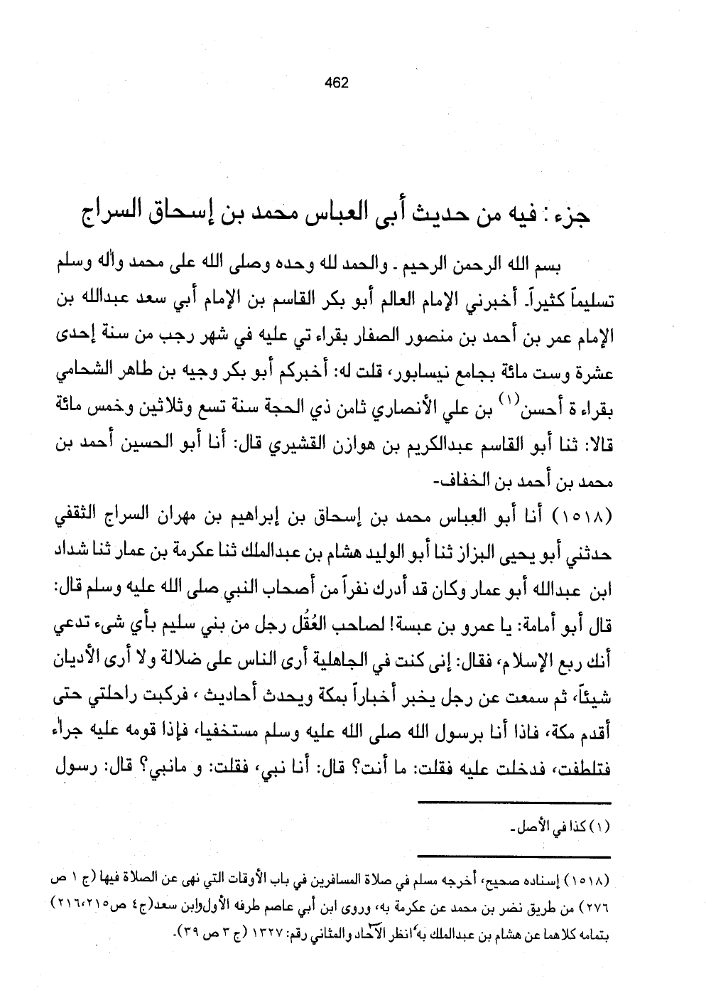 1518 - أَنَا أَبُو الْعَبَّاسِ مُحَمَّدُ بْنُ إِسْحَاقَ بْنِ إِبْرَاهِيمَ بْنِ مَهْرَانَ السَّرَّاجُ الثَّقَفِيُّ حَدَّثَنِي أَبُو يَحْيَى الْبَزَّازُ ثَنَا أَبُو الْوَلِيدِ هِشَامُ بْنُ عَبْدِ الْمَلِكِ ثَنَا عِكْرِمَةُ بْنُ عَمَّارٍ ثَنَا شَدَّادُ ابْن عَبْدِ اللَّهِ أَبُو عَمَّارٍ وَكَانَ قَدْ أَدْرَكَ نَفَرًا مِنْ أَصْحَابِ النَّبِيِّ صَلَّى اللهُ عَلَيْهِ وَسَلَّمَ قَالَ: قَالَ أَبُو أُمَامَةَ: يَا عَمْرُو بْنُ عَبَسَةَ! لِصَاحِبِ الْعَقْلِ رَجُلٌ مِنْ بَنِي سَلِيمٍ بِأَيِّ شَيْءٍ تَدَّعِي أَنَّكَ رَبْعُ الإِسْلامِ، فَقَالَ: إِنِّي كُنْتُ فِي الْجَاهِلِيَّةِ أَرَى النَّاسَ عَلَى ضَلالَةٍ وَلا أَرَى الأَدْيَانَ شَيْئًا، ثُمَّ سَمِعْتُ عَنْ رَجُلٍ يُخْبِرُ أَخْبَارًا بِمَكَّةَ وَيُحَدِّثُ أَحَادِيثَ، فَرَكِبْتُ رَاحِلَتِي حَتَّى أَقْدَمَ مَكَّةَ، فَإِذَا أَنَا بِرَسُولِ اللَّهِ صَلَّى اللهُ عَلَيْهِ وَسَلَّمَ مُسْتَخْفِيًا، فَإِذَا قَوْمُهُ عَلَيْهِ جِرَاءٌ فَتَلَطَّفْتُ، فَدَخَلْتُ عَلَيْهِ فَقُلْتُ: مَا أَنْتَ؟ قَالَ: أَنَا نَبِيٌّ، فَقُلْتُ: وَمَا نَبِيٌّ؟ قَالَ: رَسُولُ