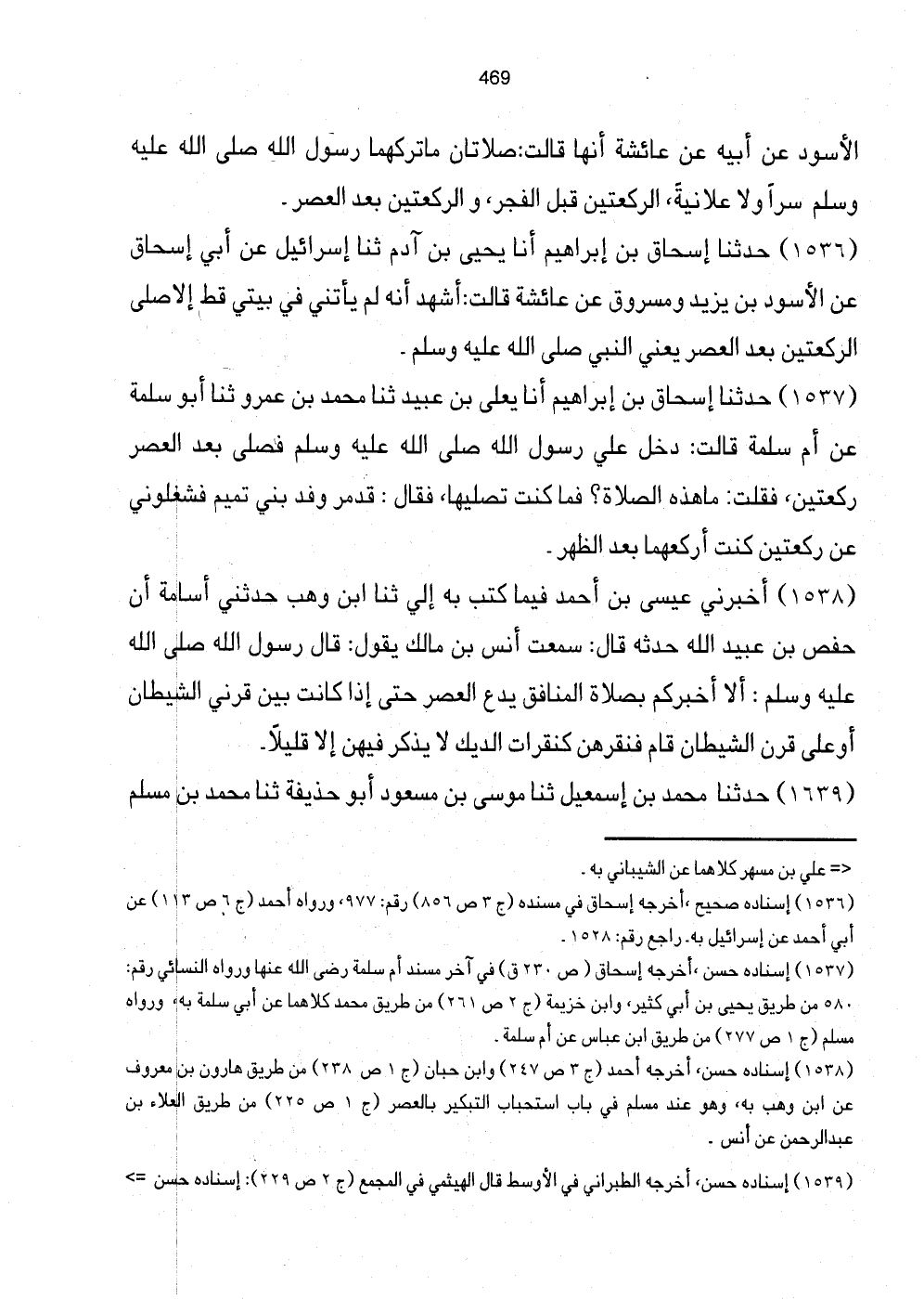 1536 - حَدَّثَنَا إِسْحَاق بْنُ إِبْرَاهِيمَ أَنَا يَحْيَى بْنُ آدَمَ ثَنَا إِسْرَائِيلُ عَنْ أَبِي إِسْحَاقَ عَنِ الأَسْوَدِ بْنِ يَزِيدَ وَمَسْرُوقٍ عَنْ عَائِشَةَ قَالَتْ: أَشْهَدُ أَنَّهُ لَمْ يَأْتِنِي فِي بَيْتِي قَطُّ إِلا صَلَّى الرَّكْعَتَيْنِ بَعْدَ الْعَصْرِ يَعْنِي النَّبِيَّ صَلَّى اللهُ عَلَيْهِ وَسَلَّمَ.