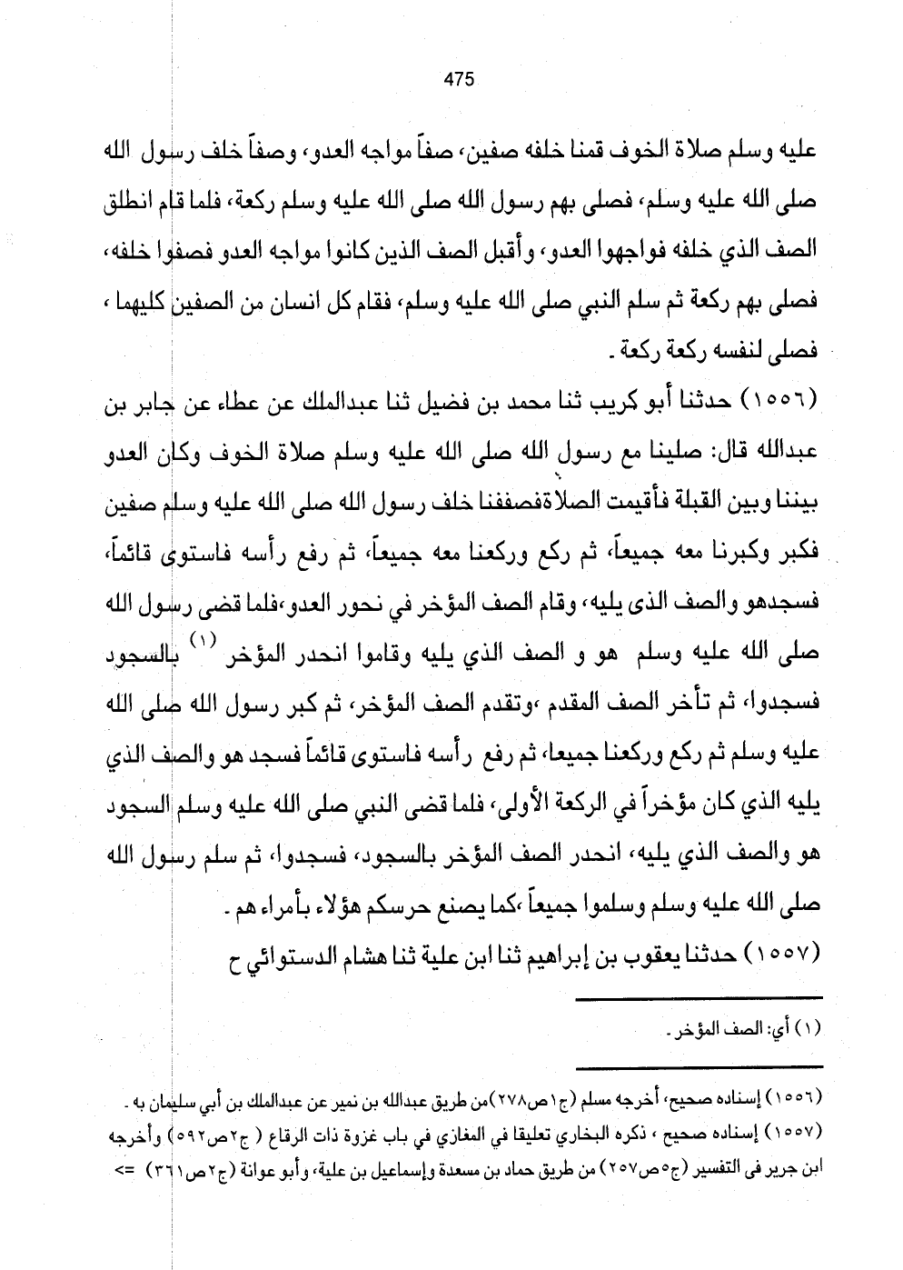 1556 - حَدَّثَنَا أَبُو كُرَيْبٍ ثَنَا مُحَمَّدُ بْنُ فُضَيْلٍ ثَنَا عَبْدُ الْمَلِكِ عَنْ عَطَاءٍ عَنْ جَابِرِ بْنِ عَبْدِ اللَّهِ قَالَ: صَلَّيْنَا مَعَ رَسُولِ اللَّهِ صَلَّى اللهُ عَلَيْهِ وَسَلَّمَ صَلاةَ الْخَوْفِ وَكَانَ الْعَدُوُّ بَيْنَنَا وَبَيْنَ الْقِبْلَةِ فَأُقِيمَتِ الصَّلاةُ فَصَفَفْنَا خَلْفَ رَسُولِ اللَّهِ صَلَّى اللهُ عَلَيْهِ وَسَلَّمَ صَفَّيْنِ فَكَبَّرَ وَكَبَّرْنَا مَعَهُ جَمِيعًا، ثُمَّ رَكَعَ وَرَكَعْنَا مَعَهُ جَمِيعًا، ثُمَّ رَفَعَ رَأْسَهُ فَاسْتَوَى قَائِمًا، فَسَجَدَ هُوَ وَالصَّفُّ الَّذِي يَلِيهِ، وَقَامَ الصَّفُّ الْمُؤَخَّرُ فِي نُحُورِ الْعَدُوِّ، فَلَمَّا قَضَى رَسُولُ اللَّهِ صَلَّى اللهُ عَلَيْهِ وَسَلَّمَ هُوَ وَالْصَفُّ الَّذِي يَلِيهِ وَقَامُوا انْحَدَرَ الْمُؤَخَّرُ (1) بِالسُّجُودِ فَسَجَدُوا، ثُمَّ تَأَخَّرَ الصَّفُّ الْمُقَدَّمُ، وَتَقَدَّمَ الصَّفُّ الْمُؤَخَّرُ، ثُمَّ كَبَّرَ رَسُولُ اللَّهِ صَلَّى اللهُ عَلَيْهِ وَسَلَّمَ ثُمَّ رَكَعَ وَرَكَعْنَا جَمِيعًا، ثُمَّ رَفَعَ رَأْسَهُ فَاسْتَوَى قَائِمًا فَسَجَدَ هُوَ وَالصَّفُّ الَّذِي يَلِيهِ الَّذِي كَانَ مُؤَخَّرًا فِي الرَّكْعَةِ الأُولَى، فَلَمَّا قَضَى النَّبِيُّ صَلَّى اللهُ عَلَيْهِ وَسَلَّمَ السُّجُودَ هُوَ وَالصَّفُّ الَّذِي يَلِيهِ، انْحَدَرَ الصَّفُّ الْمُؤَخَّرُ بِالسُّجُودِ، فَسَجَدُوا، ثُمَّ سَلَّمَ رَسُولُ اللَّهِ صَلَّى اللهُ عَلَيْهِ وَسَلَّمَ وَسَلَّمُوا جَمِيعًا، كَمَا يَصْنَعُ حَرَسُكُمْ هَؤُلاءِ بِأُمَرَاءِهِمْ.