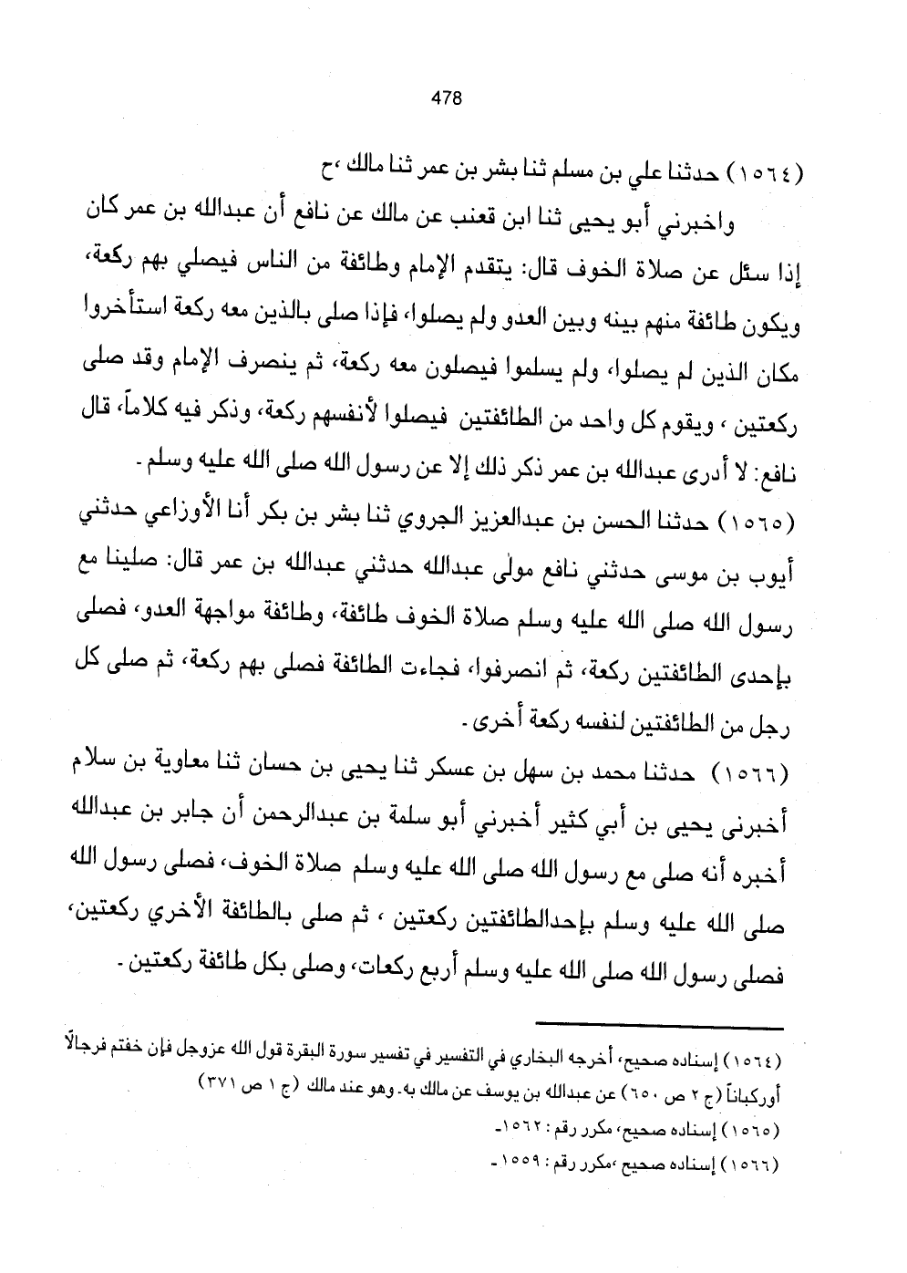 [1564] إِسْنَاده صَحِيح، أخرجه البُخَارِيّ فِي التَّفْسِير سُورَة الْبَقَرَة قَول الله عز وَجل فَإِن خِفْتُمْ فرجالاً أَو ركباناً (ج2 ص650) عَن عبد الله بن يُوسُف عَن مَالك بِهِ. وَهُوَ عِنْد مَالك (ج1 ص371) .