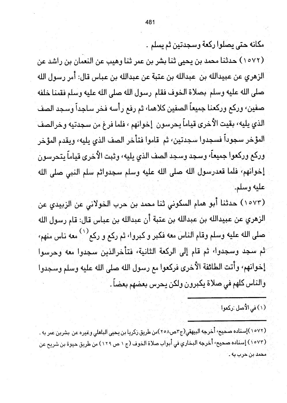 1572 - حَدَّثَنَا مُحَمَّدُ بْنُ يَحْيَى ثَنَا بِشْرُ بْنُ عُمَرٍ ثَنَا وُهَيْبٌ عَنِ النُّعْمَانِ بْنِ رَاشِدٍ عَنِ الزُّهْرِيِّ عَنْ عُبَيْدِ اللَّهِ بْنِ عَبْدِ اللَّهِ بْنِ عُتْبَةَ عَنْ عَبْدِ اللَّهِ بْنِ عَبَّاسٍ قَالَ: أَمَرَ رَسُولُ اللَّهِ صَلَّى اللهُ عَلَيْهِ وَسَلَّمَ بِصَلاةِ الْخَوْفِ فَقَامَ رَسُولُ اللَّهِ صَلَّى اللهُ عَلَيْهِ وَسَلَّمَ فَقُمْنَا خَلْفَهُ صَفَّيْنِ، وَرَكَعَ وركعنا جَمِيعًا الصفين كِلاهُمَا، ثُمَّ رَفَعَ رَأْسَهُ فَخَرَّ سَاجِدًا وَسَجَدَ الصَّفُّ الَّذِي يَلِيهِ، بَقِيَتِ الأُخْرَى قِيَامًا يَحْرُسُونَ إِخْوَانَهُمْ، فَلَمَّا فَرَغَ مِنْ سَجْدَتَيْهِ وَخَرَّ الصَّفُّ الْمُؤَخَّرُ سُجُودًا فَسَجَدُوا سَجْدَتَيْنِ، ثُمَّ قَامُوا فَتَأَخَّر الصَّفُّ الَّذِي يَلِيهِ، وَيُقَدَّمُ الْمُؤَخَّرُ وَرَكَعَ وَرَكَعُوا جَمِيعًا، وَسَجَدَ وَسَجَدَ الصَّفُّ الَّذِي يَلِيهِ، وَثَبَتَ الأُخْرَى قِيامًا يَتَحَرَّسُونَ إِخْوَانَهُمْ، فَلَمَّا قَعَدَ رَسُولُ اللَّهِ صَلَّى اللهُ عَلَيْهِ وَسَلَّمَ سَجَدُوا ثُمَّ سَلَّمَ النَّبِيُّ صَلَّى اللهُ عَلَيْهِ وَسَلَّمَ.