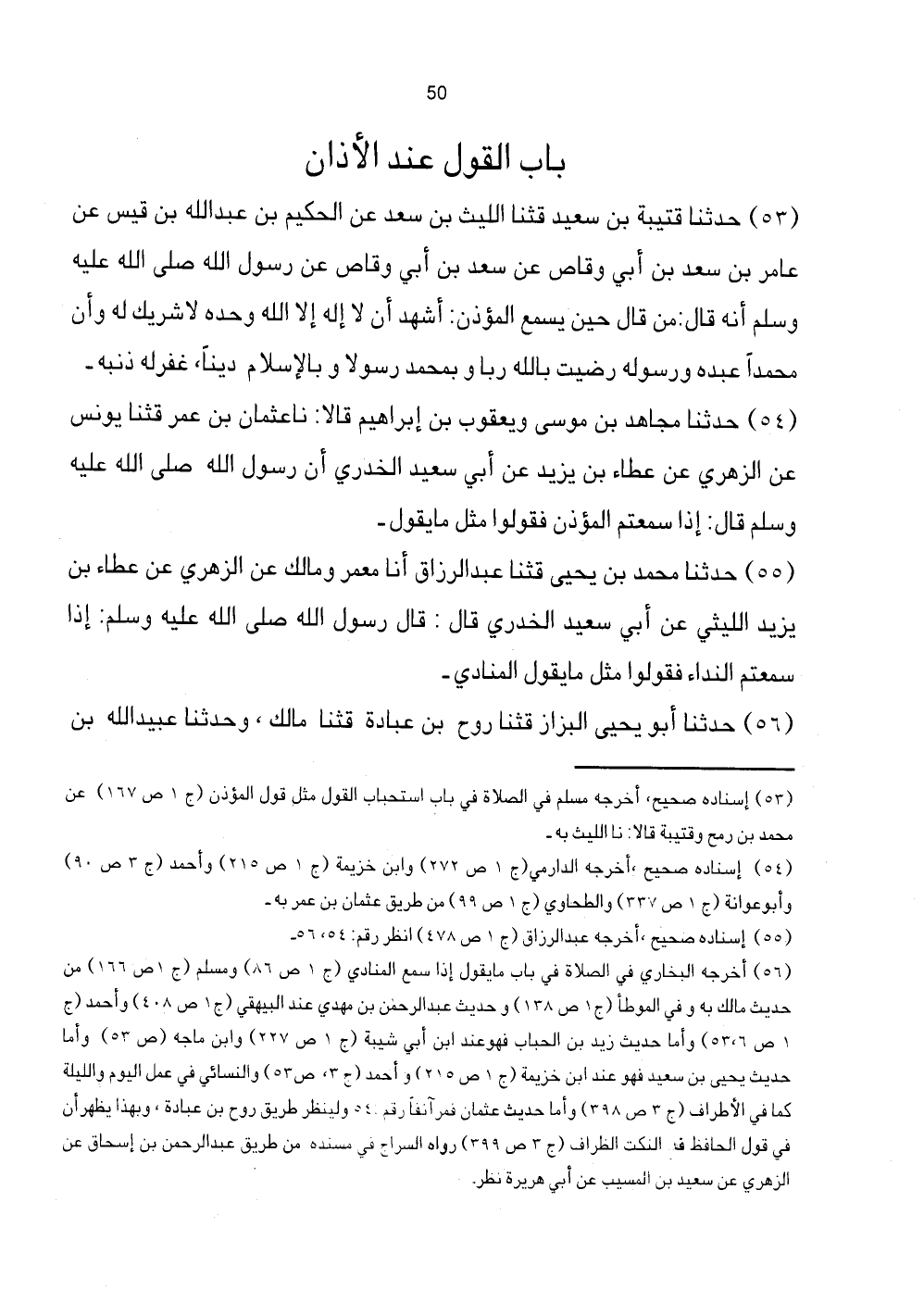 [53] إِسْنَاده صَحِيح، أخرجه مُسلم فِي الصَّلَاة فِي بَاب اسْتِحْبَاب القَوْل مثل قَول الْمُؤَذّن (ج1 ص167) عَن مُحَمَّد بن رمحوقتيبة قَالَا: نَا اللَّيْث بِهِ.