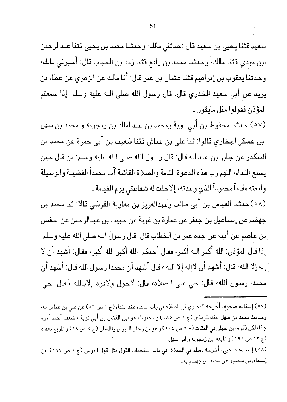[58] إِسْنَاده صَحِيح، أخرجه مُسلم فِي الصَّلَاة فِي بَاب اسْتِحْبَاب القَوْل مثل قَول الْمُؤَذّن (ج1 ص167) عَن إِسْحَاق بن مَنْصُور عَن حمد بن جَهْضَم بِهِ.