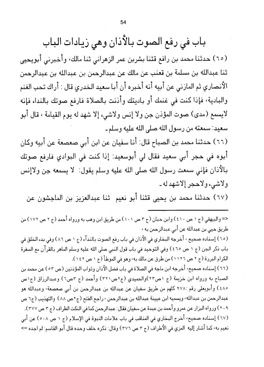 [66] إِسْنَاده صَحِيح، أخرجه ابْن مَاجَه فِي الصَّلَاة فِي بَاب فضل الْأَذَان وثواب المؤذنين (ص53) عَن مُحَمَّد بن الصَّباح بِهِ وَرَوَاهُ ابْن خُزَيْمَة (ج1 ص23) والْحميدِي (ج2 ص321) وَأحمد (ج3 ص6) وَعبد الرَّزَّاق (ج1 ص458) وَأَبُو يعلى رقم: 978 كلهم من طَرِيق سُفْيَان عَن عبد الله بن عبد الرَّحْمَن بن أبي صعصعة، وَعبد الله هُوَ عبد الرَّحْمَن بن عبد الله، ويسميه ابْن عُيَيْنَة عبد الله بن عبد الرَّحْمَن، رَاجع الْفَتْح (ج2 ص88) والتهذيب (ج6 ص209) وَرَوَاهُ الْبَزَّار عَن عَمْرو وَأحد بن عَبدة عَن سُفْيَان فَقَالَ: عبد الرَّحْمَن كَمَا فِي النكت الظراف (ج3 ص377) .
