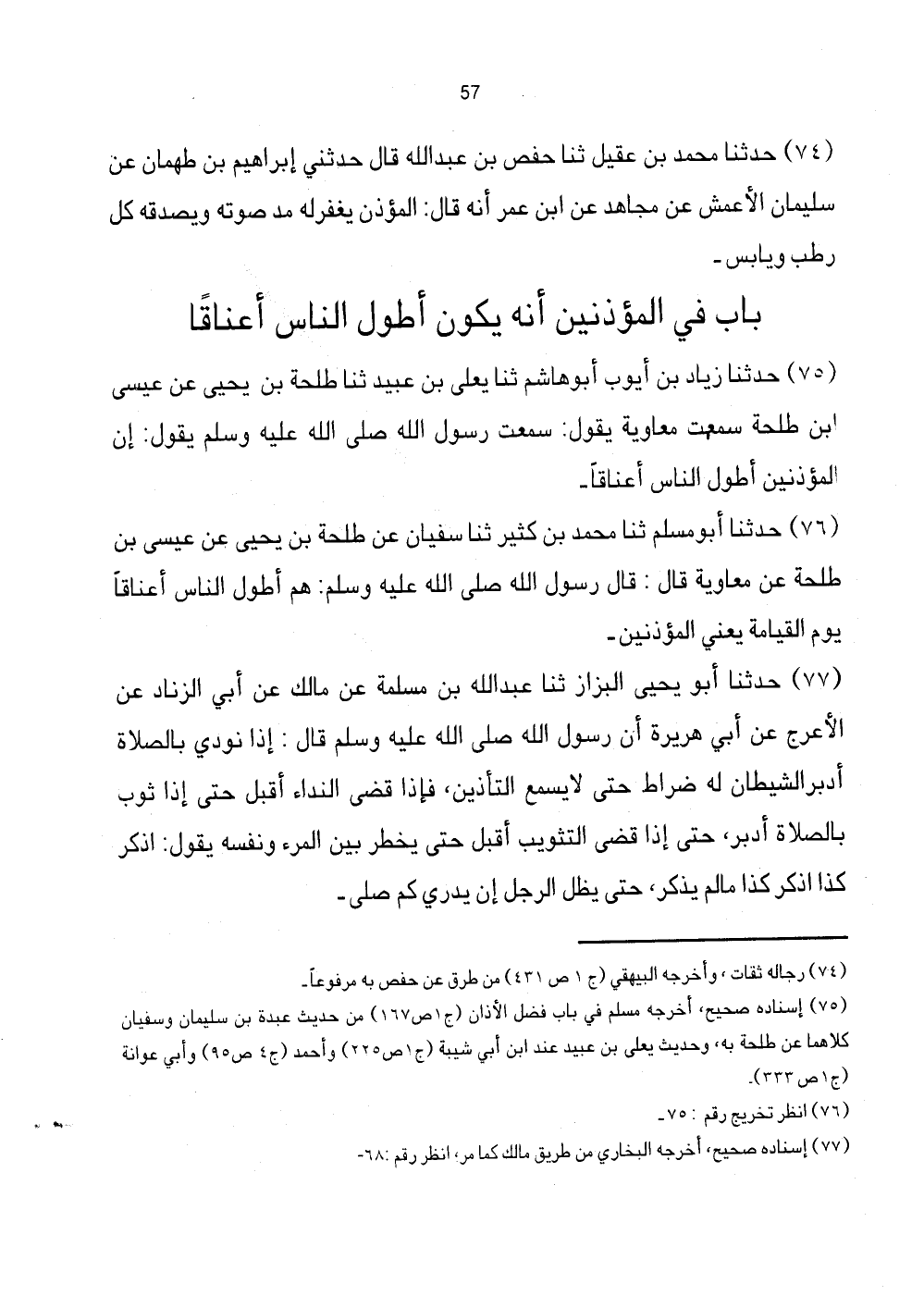 [75] إِسْنَاده صَحِيح، أخرجه مُسلم فِي بَاب فضل الْأَذَان (ج1 ص167) من حَدِيث عَبدة بن سُلَيْمَان وسُفْيَان كِلَاهُمَا عَن طَلْحَة بِهِ، وَحَدِيث يعلى بن عبيد عِنْد ابْن أبي شيبَة (ج1 ص225) وَأحمد (ج4 ص95) وَأبي عوَانَة (ج1 ص333) .