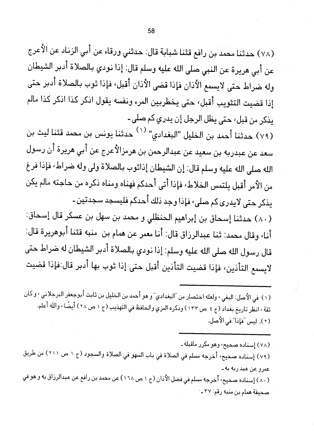 79 - حَدَّثَنَا أَحْمَدُ بْنُ الْخَلِيلِ "الْبَغْدَادِيُّ" (1) حَدَّثَنَا يُونُسُ بن مُحَمَّد فثنا لَيْثُ بْنُ سَعْدٍ عَنْ عَبْدِ رَبِّهِ بْنِ سَعِيدٍ عَنْ عَبْدِ الرَّحْمَنِ بْنِ هُرْمُزٍ الأَعْرَجِ عَنْ أَبِي هُرَيْرَةَ أَنَّ رَسُولَ اللَّهِ صَلَّى اللهُ عَلَيْهِ وَسَلَّمَ: إِنَّ الشَّيْطَانَ إِذَا ثُوِّبَ بِالصَّلاةِ وَلَّى وَلَهُ ضِرَاطٌ، فَإِذَا فَرِغَ مِنَ الأَمْرِ أَقْبَلَ يَلْتَمِسُ الْخِلاطَ، فَإِذَا أَتَى أَحَدُكُمْ فَهَنَّاهُ وَمَنَّاهُ ذَكَّرَهُ مِنْ حَاجَتِهِ مَا لَمْ يَكُنْ يَذْكُرُ حَتَّى لَا يَدْرِي كَمْ صَلَّى اللهُ عَلَيْهِ وَسَلَّمَ، فَإِذَا وَجَدَ ذَلِكَ أَحَدُكُمْ فَلْيَسْجُدْ سَجْدَتَيْنِ.