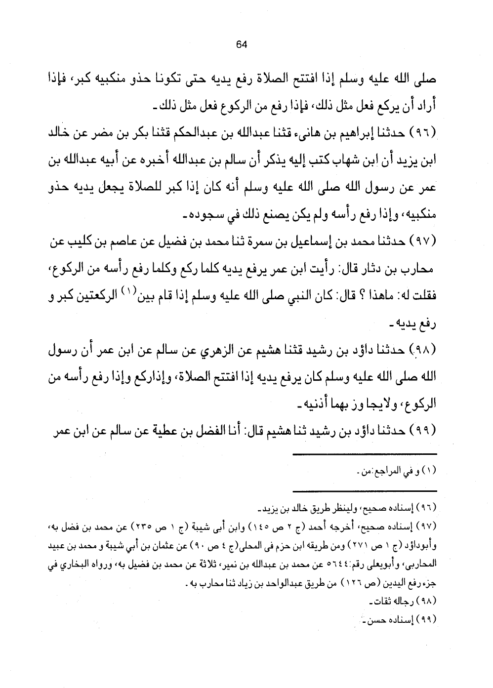 [97] إِسْنَاده صَحِيح، أخرجه أَحْمد (ج2 ص145) وَابْن أبي شيبَة (ج1 ص235) عَن مُحَمَّد بن فضل بِهِ، وَأَبُو داؤد (ج1 ص271) وَمن طَرِيقه ابْن حزم فِي الْمحلى (ج4 ص90) عَن عُثْمَان بن أبي شيبَة وَمُحَمّد بن عبيد الْمحَاربي، وَأَبُو يعلى رقم: 5644 عَن مُحَمَّد بن عبد الله بن نمير، ثَلَاثَة عَن مُحَمَّد بن فُضَيْل بِهِ، وَرَوَاهُ البُخَارِيّ فِي جُزْء رفع الْيَدَيْنِ (ص126) من طَرِيق عبد الْوَاحِد بن زِيَاد ثَنَا محَارب بِهِ.