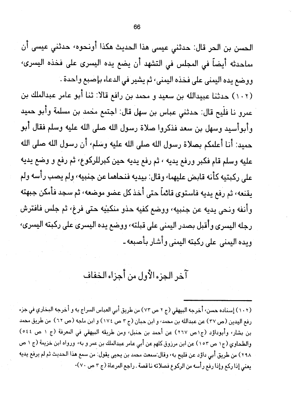 [102] إِسْنَاده حسن، أخرجه الْبَيْهَقِيّ (ج2 ص73) من طَرِيق أبي الْعَبَّاس السراج بِهِ وَأخرجه البُخَارِيّ فِي جُزْء رفع الْيَدَيْنِ (ص37) عَن عبد الله بن مُحَمَّد، وَابْن حبَان (ج3 ص174) عَن أَحْمد بن حَنْبَل، وَمن طَرِيق الْبَيْهَقِيّ فِي الْمعرفَة (ج1 ص544) والطَّحَاوِي (ج1 ص153) عَن ابْن مَرْزُوق كلهم عَن أبي عَامر عبد الْملك بن عَمْرو بِهِ. وَرَوَاهُ ابْن خُزَيْمَة (ج1 ص298) من طَرِيق أبي داؤد عَن فليح بِهِ، وَقَالَ: سَمِعت مُحَمَّد بن يحيى يَقُول: من سمع هَذَا الحَدِيث ثمَّ لم يرفع يَدَيْهِ يَعْنِي إِذا ركع وَإِذا رفع رَأسه من الرُّكُوع فَصلَاته نَاقِصَة. رَاجع المرعاة (ج3 ص70) .