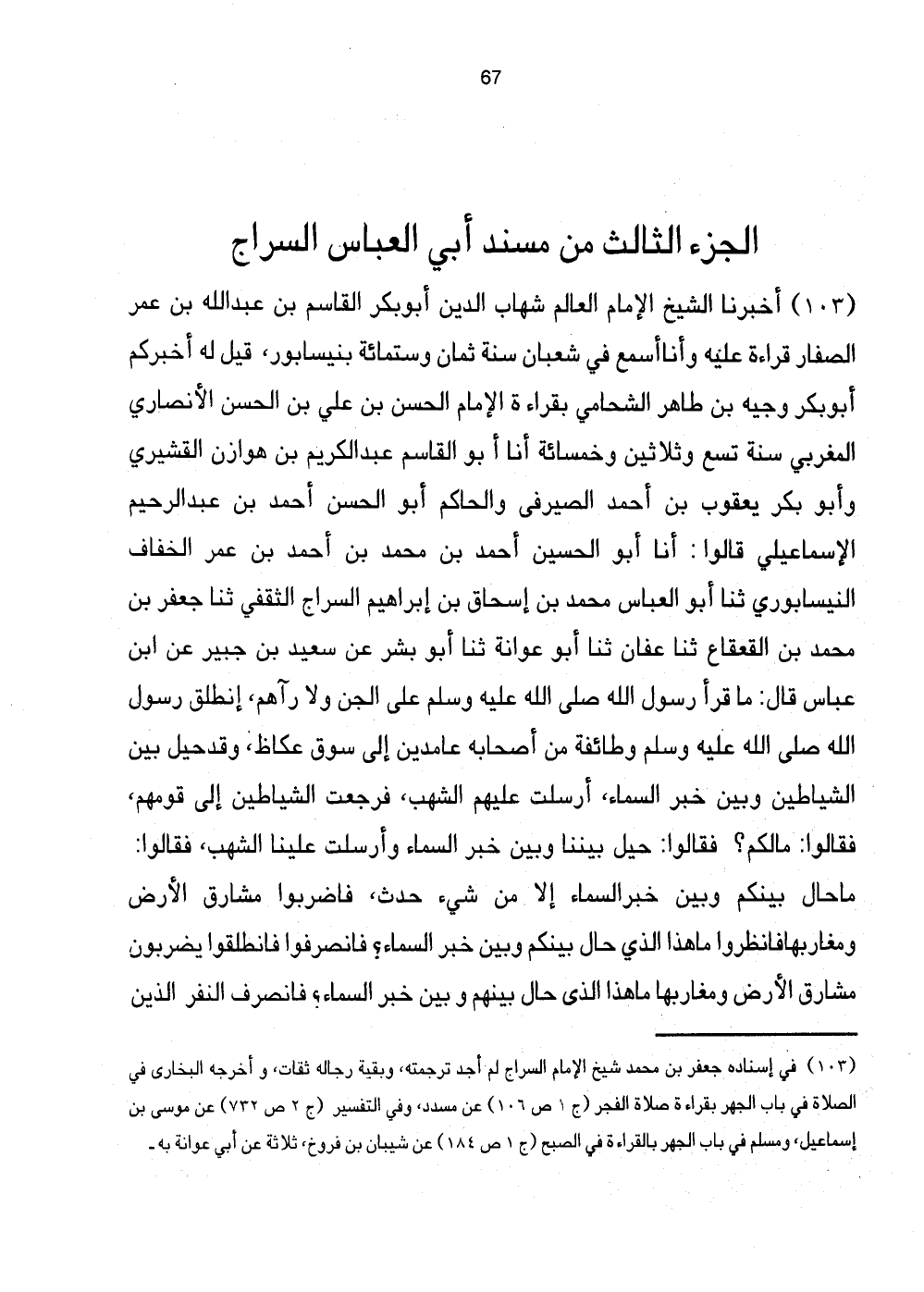 103 - أَخْبَرَنَا الشَّيْخُ الإِمَامُ الْعَالِمُ شِهَابُ الدِّينِ أَبُو بَكْرٍ الْقَاسِمُ بْنُ عَبْدِ اللَّهِ بن عمر الصفارة قِرَاءَةً عَلَيْهِ وَأَنَا أَسْمَعُ فِي شَعْبَانَ سنة ثَمَان وسِتمِائَة بِنَيْسَابُورَ، قِيلَ لَهُ أَخْبَرَكُمْ أَبُو بَكْرٍ وَجِيهُ بْنُ طَاهِرٍ الشَّحَّامِيُّ بِقِرَاءَةِ الإِمَامِ الْحَسَنِ بْنِ عَلِيِّ بْنِ الْحَسَنِ الأَنْصَارِيِّ الْمَغْرِبِيِّ سَنَةَ تِسْعٍ وَثَلاثِينَ وَخَمْسِمِائَةٍ أَنَا أَبُو الْقَاسِم عبد اللكريم بْنُ هَوَازِنَ الْقُشَيْرِيُّ وَأَبُو بَكْرٍ يَعْقُوبُ بْنُ أَحْمَدَ الصَّيْرَفِيُّ وَالْحَاكِمُ وَأَبُو الْحَسَنِ أَحْمَدُ بْنُ عَبْدِ الرَّحِيمِ الإِسْمَاعِيلِيُّ قَالُوا: أَنَا أَبُو الْحُسَيْنِ أَحْمَدُ بْنُ مُحَمَّدِ بْنِ أَحْمَدَ بْنِ عُمَرَ الْخَفَّافُ النَّيْسَابُورِيُّ ثَنَا أَبُو الْعَبَّاسِ مُحَمَّدُ بْنُ إِسْحَاقَ بْنِ إِبْرَاهِيمَ السَّرَّاجُ الثَّقَفِيُّ ثَنَا جَعْفَرُ بْنُ مُحَمَّدِ بْنِ القَعْقَاعِ ثَنَا عَفَّانُ ثَنَا أَبُو عُوَانَةَ ثَنَا أَبُو بِشْرٍ عَنْ سَعِيدِ بْنِ جُبَيْرٍ عَنِ ابْنِ عَبَّاسٍ قَالَ: مَا قَرَأَ رَسُولُ اللَّهِ صَلَّى اللهُ عَلَيْهِ وَسَلَّمَ عَلَى الْجِنِّ وَلا رَآهُمْ، انْطَلَقَ رَسُولُ اللَّهِ صَلَّى اللهُ عَلَيْهِ وَسَلَّمَ وَطَائِفَةٌ مِنْ أَصْحَابِهِ عَامِدِينَ إِلَى سُوقِ عُكَاظٍ، وَقَدْ حِيلَ بَيْنَ الشَّيَاطِينِ وَبَيْنَ خَبَرِ السَّمَاءِ، أُرْسَلِتْ عَلَيْهِمُ الشُّهُبَ، فَرَجَعَتِ الشَّيَاطِينُ إِلَى قَوْمِهِمْ، فَقَالُوا: مَالَكُمْ؟ فَقَالُوا: حِيلَ بَيْنَنَا وَبَين خبر الْمسَاء وَأُرْسِلَتْ عَلَيْنَا الشُّهُبَ، فَقَالُوا: مَا حَالَ بَيْنَكُمْ وَبَيْنَ خَبَرِ السَّمَاءِ إِلا مِنْ شَيْءٍ حَدَثَ، فَاضْرِبُوا مَشَارِقَ الأَرْضِ وَمَغَارِبَهَا فَانْظُرُوا مَا هَذَا الَّذِي حَالَ بَيْنَكُمْ وَبَيْنَ خَبَرِ السَّمَاءِ؟ فَانْصَرِفُوا فَانْطَلقُوا يضْربُونَ مشارك الأَرْضِ وَمَغَارِبِهَا مَا هَذَا الِّذِي حَالَ بَيْنَهُمْ وَبَين خبر الْمسَاء؟ فَانْصَرَفَ النَّفَرُ الَّذِينَ