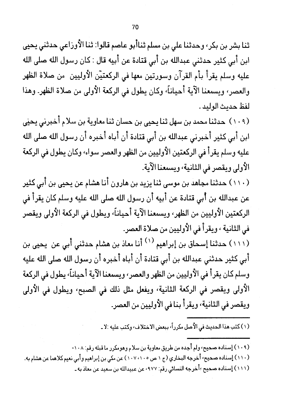 [110] إِسْنَاده صَحِيح، أخرجه البُخَارِيّ (ج1 ص105، 107) عَن مكي بن إِبْرَاهِيم وَأبي نعيم كِلَاهُمَا عَن هِشَام بِهِ.