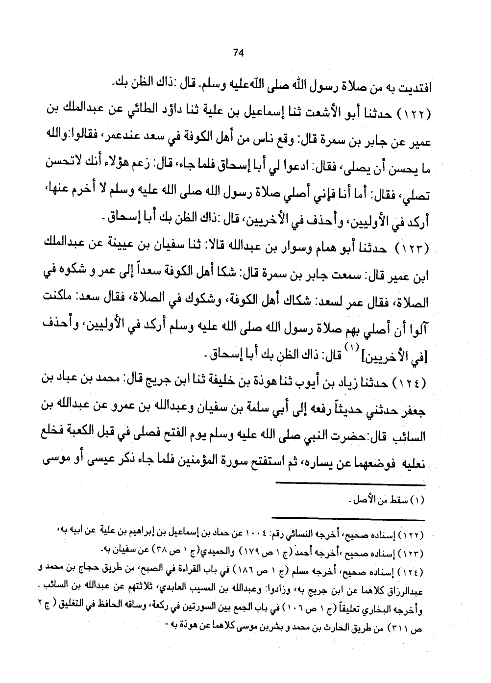 [122] إِسْنَاده صَحِيح، أخرجه النَّسَائِيّ رقم: 1004 عَن حَمَّاد بن إِسْمَاعِيل بن إِبْرَاهِيم بن علية عَن أَبِيه بِهِ.