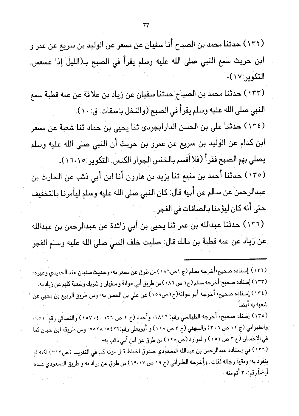 132 - حَدَّثَنَا مُحَمَّدُ بْنُ الصَّبَّاحِ أَنَا سُفْيَانُ عَنْ مسعر بن الْوَلِيدِ بْنِ سَرِيعٍ عَنْ عَمْرِو ابْن حُرَيْثٍ سَمِعَ النَّبِيَّ صَلَّى اللهُ عَلَيْهِ وَسَلَّمَ يَقْرَأُ فِي الصُّبْحِ بـ (اللَّيْل إِذَا عَسْعَسَ. التكوير: 17) .