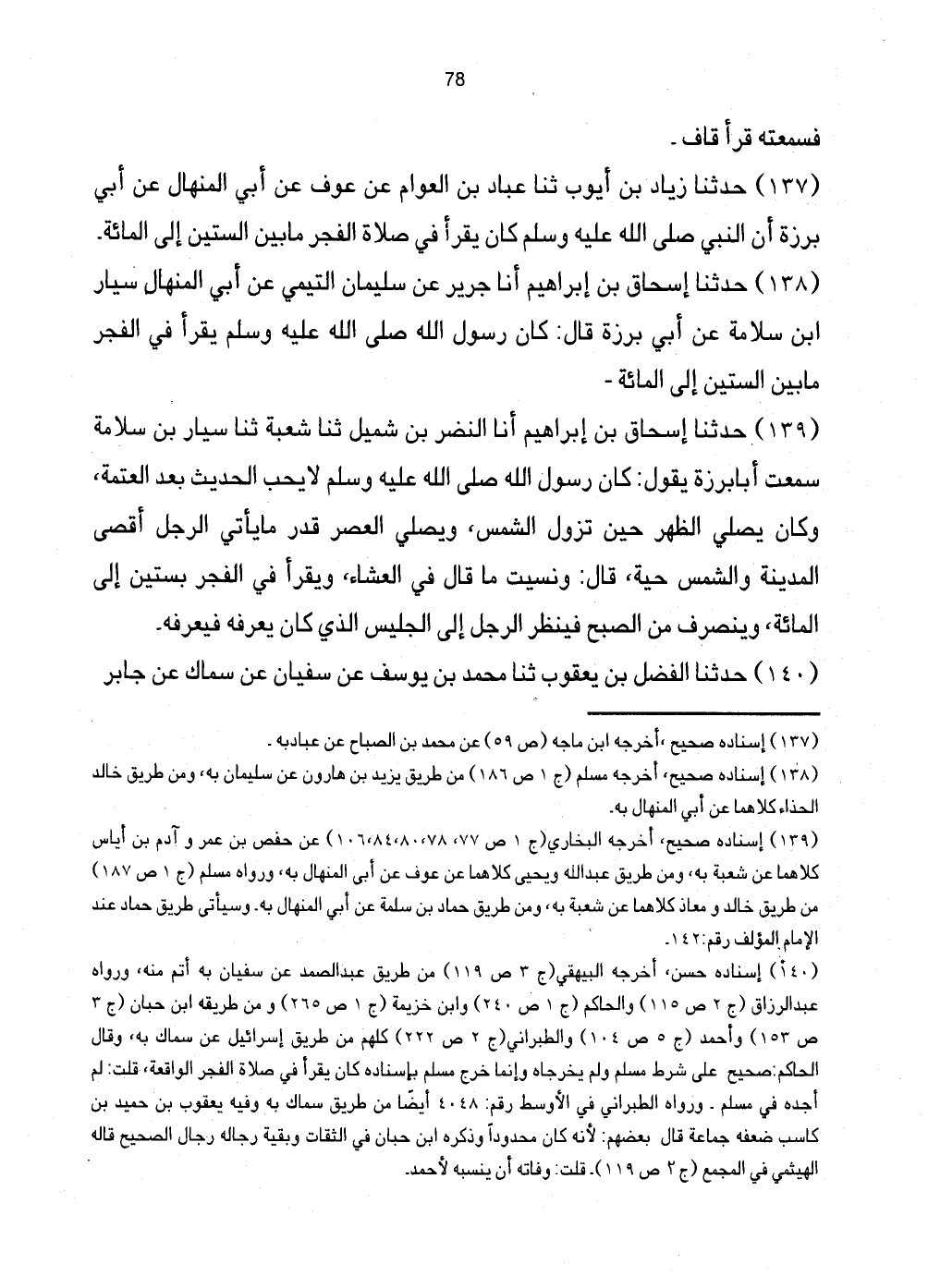 138 - حَدَّثَنَا إِسْحَاقُ بْنُ إِبْرَاهِيمَ أَنَا جَرِيرٌ عَنْ سُلَيْمَانَ التَّيْمِيِّ عَنْ أَبِي الْمِنْهَالِ سَيَّارِ ابْن سَلامَةَ عَنْ أَبِي بَرْزَةَ قَالَ: كَانَ رَسُولُ اللَّهِ صَلَّى اللهُ عَلَيْهِ وَسَلَّمَ يَقْرَأُ فِي الْفَجْرِ مَا بَيْنَ السِّتِّينَ إِلَى الْمِائَةِ.