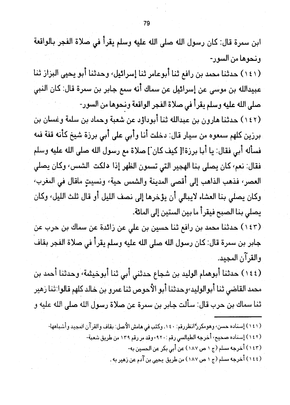 143 - حَدَّثَنَا مُحَمَّدُ بْنُ رَافِعٍ ثَنَا حُسَيْنُ بْنُ عَلِيٍّ عَنْ زَائِدَةَ عَنْ سِمَاكِ بْنِ حَرْبٍ عَنْ جَابِرِ بْنِ سَمُرَةَ قَالَ: كَانَ رَسُولُ اللَّهِ صَلَّى اللهُ عَلَيْهِ وَسَلَّمَ يَقْرَأُ فِي صَلَاة الْفجْر بقاف وَالْقُرْآنِ الْمَجِيدِ.