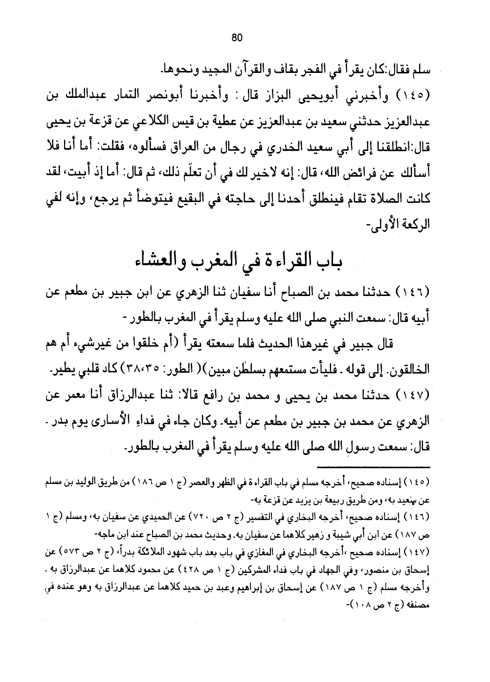 146 - حَدَّثَنَا مُحَمَّدُ بْنُ الصَّبَّاحِ أَنَا سُفْيَانُ ثَنَا الزُّهْرِيُّ عَنِ ابْنِ جُبَيْرِ بْنِ مُطْعَمٍ عَنْ أَبِيهِ قَالَ: سَمِعْتُ النَّبِيَّ صَلَّى اللهُ عَلَيْهِ وَسَلَّمَ يَقْرَأُ فِي الْمَغْرِبِ بِالطُّورِ.