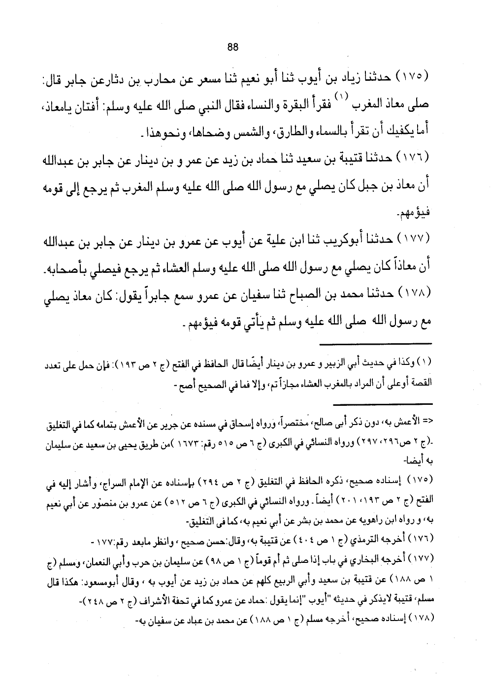 176 - حَدَّثَنَا قُتَيْبَةُ بْنُ سَعِيدٍ ثَنَا حَمَّادُ بْنُ زيد عَن عمر وبن دِينَارٍ عَنْ جَابِرِ بْنِ عَبْدِ اللَّهِ أَنَّ معَاذ بن جلّ كَانَ يُصَلِّي مَعَ رَسُولِ اللَّهِ صَلَّى اللهُ عَلَيْهِ وَسَلَّمَ الْمَغْرِبَ ثُمَّ يَرْجِعُ إِلَى قَوْمِهِ فَيَؤُمُّهُمْ.