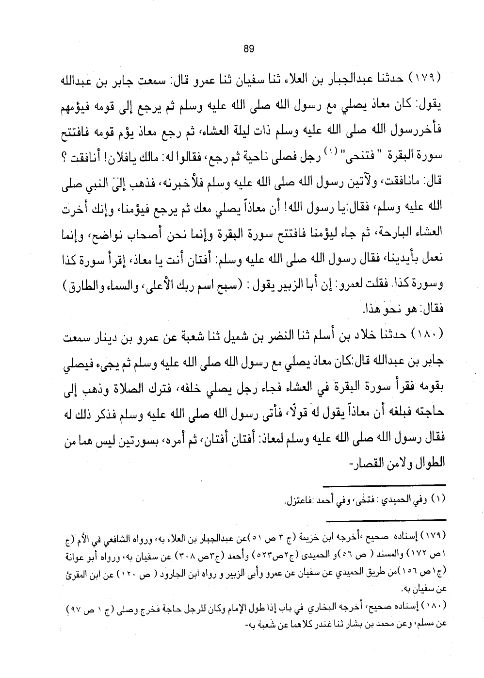 179 - حَدَّثَنَا عَبْدُ الْجَبَّارِ بْنُ الْعَلاءِ ثَنَا سُفْيَانُ ثَنَا عَمْرٌو قَالَ: سَمِعْتُ جَابِرَ بْنَ عَبْدِ اللَّهِ يَقُولُ: كَانَ مُعَاذٌ يُصَلِّي مَعَ رَسُولِ اللَّهِ صَلَّى اللهُ عَلَيْهِ وَسَلَّمَ ثُمَّ يَرْجِعُ إِلَى قَوْمِهِ فَيَؤُمُّهُمْ فَأَخَّرَ رَسُولُ اللَّهِ صَلَّى اللهُ عَلَيْهِ وَسَلَّمَ ذَاتَ لَيْلَةٍ الْعِشَاءَ، ثُمَّ رَجَعَ مُعَاذٌ يَؤُمُّ قَوْمَهُ فَافْتَتَحَ سُورَةَ الْبَقَرَةِ "فَتَنَحَّى" (1) رَجُلٌ فَصَلَّى نَاحِيَةً ثُمَّ رَجَعَ، فَقَالُوا لَهُ: مَالَكَ يَا فُلانُ! أَنَافَقْتَ؟ قَالَ: مَا نَافَقْتُ، وَلآتِيَنَّ رَسُولَ اللَّهِ صَلَّى اللهُ عَلَيْهِ وَسَلَّمَ فَلأُخْبِرَنَّهُ، فَذَهَبَ إِلَى النَّبِيِّ صَلَّى اللهُ عَلَيْهِ وَسَلَّمَ، فَقَالَ: يَا رَسُولَ الله أَن معَاذ يُصَلِّي مَعَكَ ثُمَّ يَرْجِعُ فَيَؤُمُّنَا، وَإِنَّكَ أَخَّرْتَ الْعِشَاءَ الْبَارِحَةَ، ثُمَّ جَاءَ لِيَؤُمَّنَا فَافْتَتَحَ سُورَةَ الْبَقَرَةِ وَإِنَّمَا نَحْنُ أَصْحَابُ نَوَاضِحَ، وَإِنَّمَا نَعْمَلُ بِأَيْدِينَا، فَقَالَ رَسُولُ اللَّهِ صَلَّى اللهُ عَلَيْهِ وَسَلَّمَ: أَفَتَّانٌ أَنْتَ يَا مُعَاذُ، اقْرَأْ سُورَةَ كَذَا وَسُورَةَ كَذَا. فَقُلْتُ لِعَمْرٍو: إِنَّ أَبَا الزُّبَيْرِ يَقُولُ: (سَبِّحِ اسْمَ رَبِّكَ الأَعْلَى، وَالسَّمَاءِ وَالطَّارِقِ) فَقَالَ: هُوَ نَحْوُ هَذَا.
