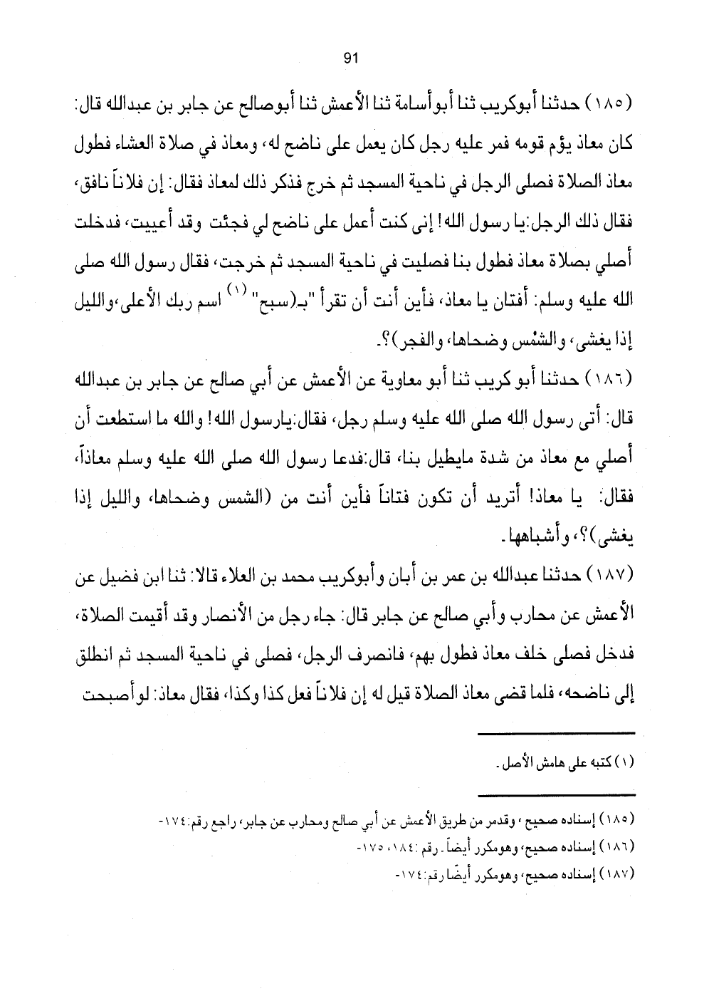 185 - حَدَّثَنَا أَبُو كُرَيْبٍ ثَنَا أَبُو أُسَامَةَ ثَنَا الأَعْمَشُ ثَنَا أَبُو صَالِحٍ عَنْ جَابِرِ بْنِ عَبْدِ اللَّهِ قَالَ: كَانَ مُعَاذٌ يَؤُمُّ قَوْمَهُ فَمَرَّ عَلَيْهِ رَجُلٌ كَانَ يَعْمَلُ عَلَى نَاضِحٍ لَهُ، وَمُعَاذٌ فِي صَلاةِ الْعِشَاءِ فَطَوَّلَ مُعَاذٌ الصَّلاةَ فَصَلَّى الرَّجُلُ فِي نَاحِيَةِ الْمَسْجِدِ ثُمَّ خَرَجَ فَذُكِرَ ذَلِكَ لِمُعَاذٍ فَقَالَ: إِنَّ فُلانًا نَافَقَ، فَقَالَ ذَلِكَ الرَّجُلُ: يَا رَسُولَ اللَّهِ! إِنِّي كُنْتُ أَعْمَلُ عَلَى نَاضِحٍ لِي فَجِئْتُ وَقَدْ أُعْيِيتُ، فَدَخَلْتُ أُصَلِّي بِصَلاةِ مُعَاذٍ فَطَوَّلَ بِنَا فَصَلَّيْتُ فِي نَاحِيَةِ الْمَسْجِدِ ثُمَّ خَرَجْتُ، فَقَالَ رَسُولُ اللَّهِ صَلَّى اللهُ عَلَيْهِ وَسَلَّمَ: أَفَتَّانٌ يَا مُعَاذُ، فَأَيْنَ أَنْتَ أ، تَقْرَأَ " بـ (سَبِّحِ (1) اسْمَ رَبِّكَ الأَعْلَى، وَاللَّيْلِ إِذَا يَغْشَى، وَالشَّمْسِ وَضُحَاهَا، وَالْفَجْرِ) ؟.