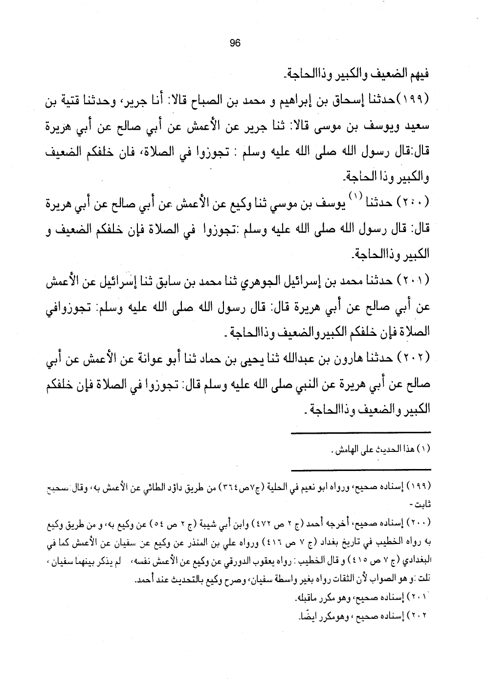 199 - حَدَّثَنَا إِسْحَاقُ بْنُ إِبْرَاهِيمَ وَمُحَمَّدُ بْنُ الصَّبَّاحِ قَالا: أَنَا جرير، وَحدثنَا قتية بْنُ سَعِيدٍ وَيُوسُفُ بْنُ مُوسَى قَالا: ثَنَا جَرِيرٌ عَنِ الأَعْمَشِ عَنْ أَبِي صَالِحٍ عَنْ أَبِي هُرَيْرَةَ قَالَ: قَالَ رَسُولُ اللَّهِ صَلَّى اللهُ عَلَيْهِ وَسَلَّمَ: تَجَوَّزُوا فِي الصَّلاةِ، فَإِنَّ خلفكم الضَّعِيف والكير وَذَا الْحَاجَةِ.