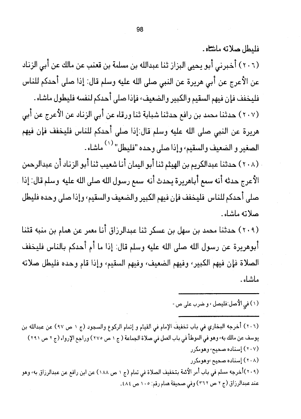 207 - حَدَّثَنَا مُحَمَّدُ بْنُ رَافِعٍ حَدَّثَنَا شَبَابَةُ ثَنَا وَرْقَاءُ عَنْ أَبِي الزِّنَادِ عَنِ الأَعْرَجِ عَنْ أَبِي هُرَيْرَةَ عَنِ النَّبِيِّ صَلَّى اللهُ عَلَيْهِ وَسَلَّمَ قَالَ: إِذَا صَلَّى اللهُ عَلَيْهِ وَسَلَّمَ أَحَدُكُمْ لِلنَّاسِ فَلْيُخَفِّفْ فَإِنَّ فِيهُمُ الصَّغِيرَ وَالضَّعِيفَ وَالسَّقِيمَ، وَإِذَا صَلَّى وَحْدَهُ "فَلْيُطِلْ" (1) مَا شَاءَ.