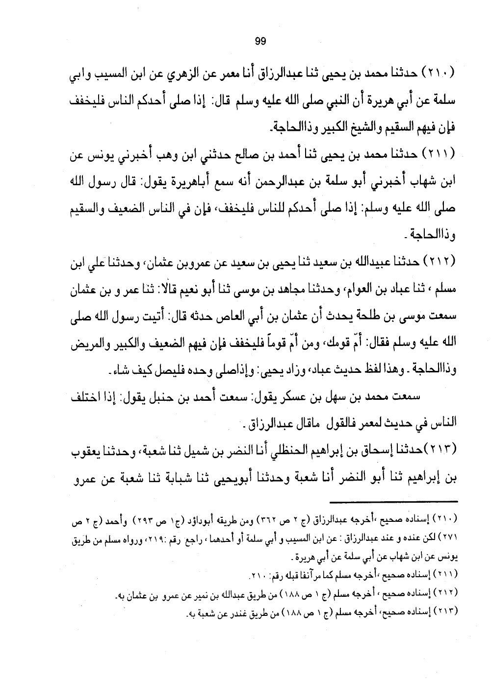 210 - حَدَّثَنَا مُحَمَّدُ بْنُ يَحْيَى ثَنَا عَبْدُ الرَّزَّاقِ أَنَا مَعْمَرٌ عَنِ الزُّهْرِيِّ عَنِ ابْنِ الْمُسَيِّبِ وَأَبِي سَلَمَةَ عَنْ أَبِي هُرَيْرَةَ أَنَّ النَّبِيَّ صَلَّى اللهُ عَلَيْهِ وَسَلَّمَ قَالَ: إِذَا صلى أحدكُم النَّاس فَلْيُخَفِّفْ فَإِنَّ فِيهُمُ السَّقِيمَ وَالشَّيْخَ الْكَبِيرَ وَذَا الْحَاجَةِ.