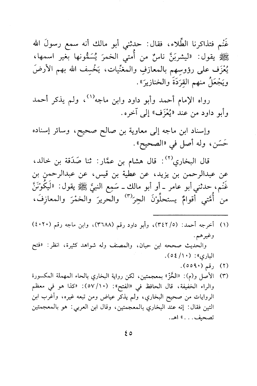 من أمتي أقوام يستحلون الحر (3) والحرير والخمر والمعازف،