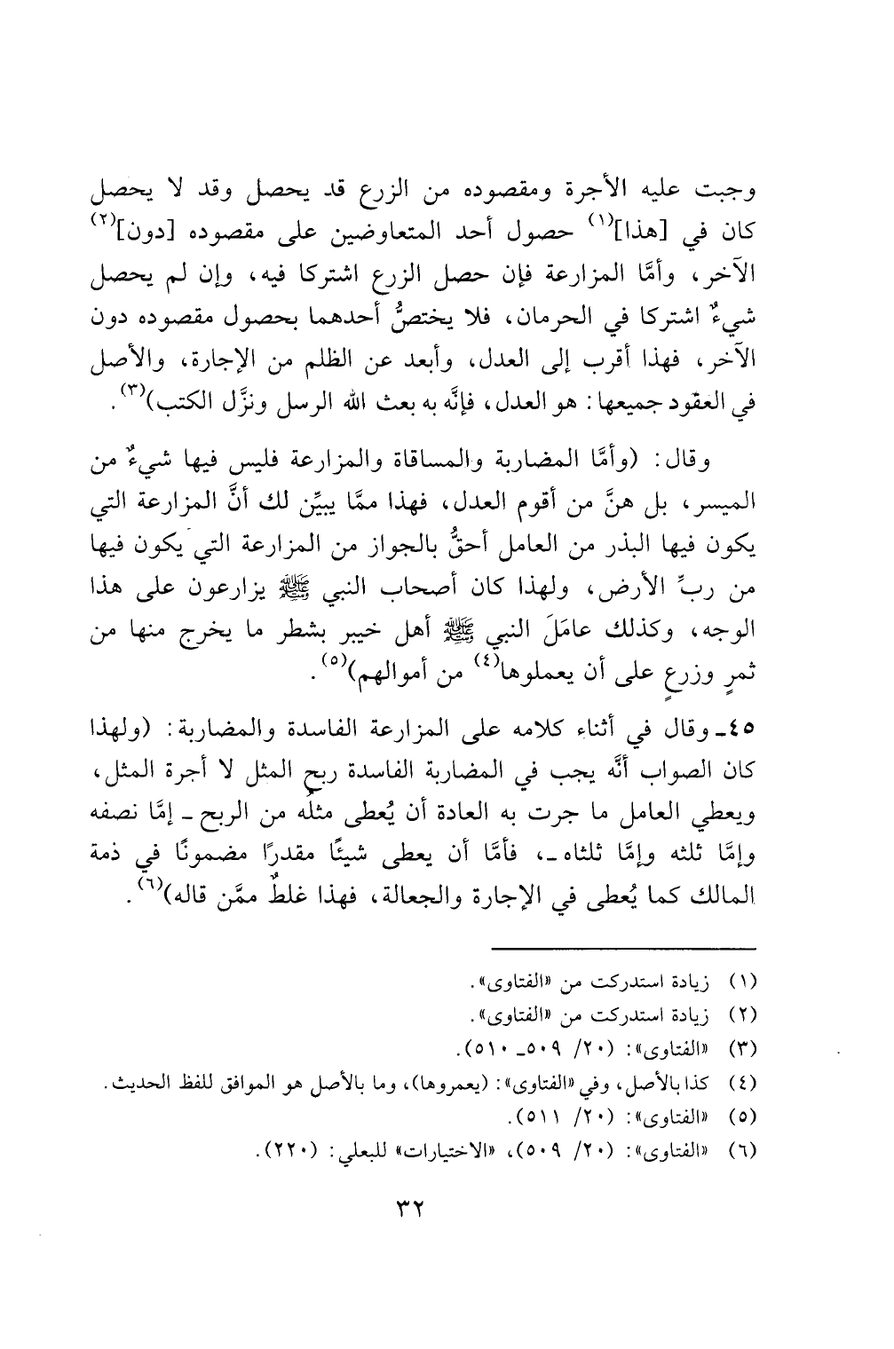 45 - وقال في أثناء كلامه على المزارعة الفاسدة والمضاربة: (ولهذا
