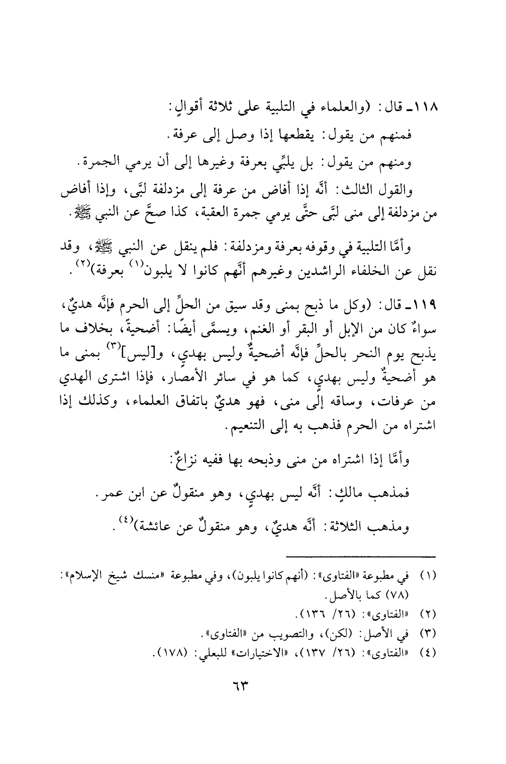 118 - قال: (والعلماء في التلبية على ثلاثة اقوال: