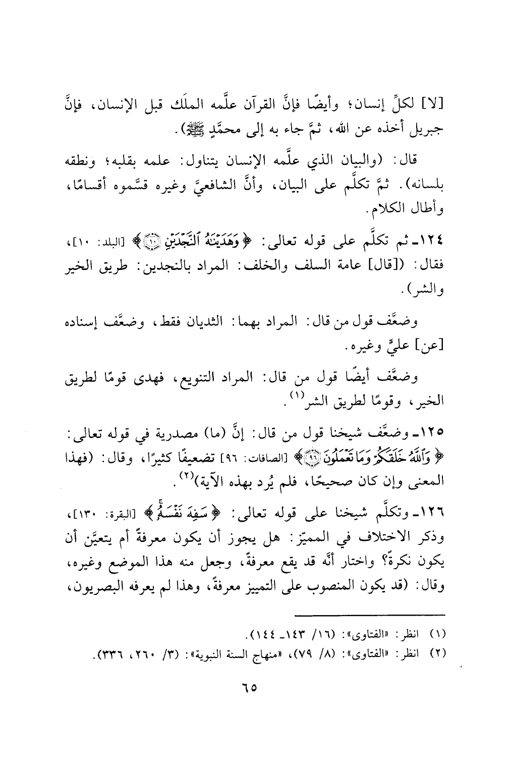 124 - ثم تكلم على قوله تعالى: <وهدنه النجديق رص *) [البدد: 10]،