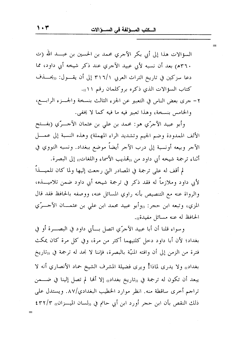 وسواء قلنا أن أبا عبيد الآجرّي اتصل بأبي داود في البصرة أو في بغداد؛ لأن أبا داود دخل كلتيهما أكثر من مرة، وفي كل مرة كان يمكث فترة من الزمن إلى أن وافته المنيّة بالبصرة، فإننا لا نجد له ترجمة في "تاريخ بغداد" ولا يدرى لماذا! ويرى فضيلة المشرف الشيخ حماد الأنصاري أنه لا يبعد أن تكون له ترجمة في "تاريخ بغداد" إلا أنها لم تصل إلينا في ضمن تراجم أخرى ساقطة منه. انظر موارد الخطيب البغدادي/87. ويستدل على ذلك النقص بأن ابن حجر أورد ابن أبي حاتم في "لسان الميزان" 3/432