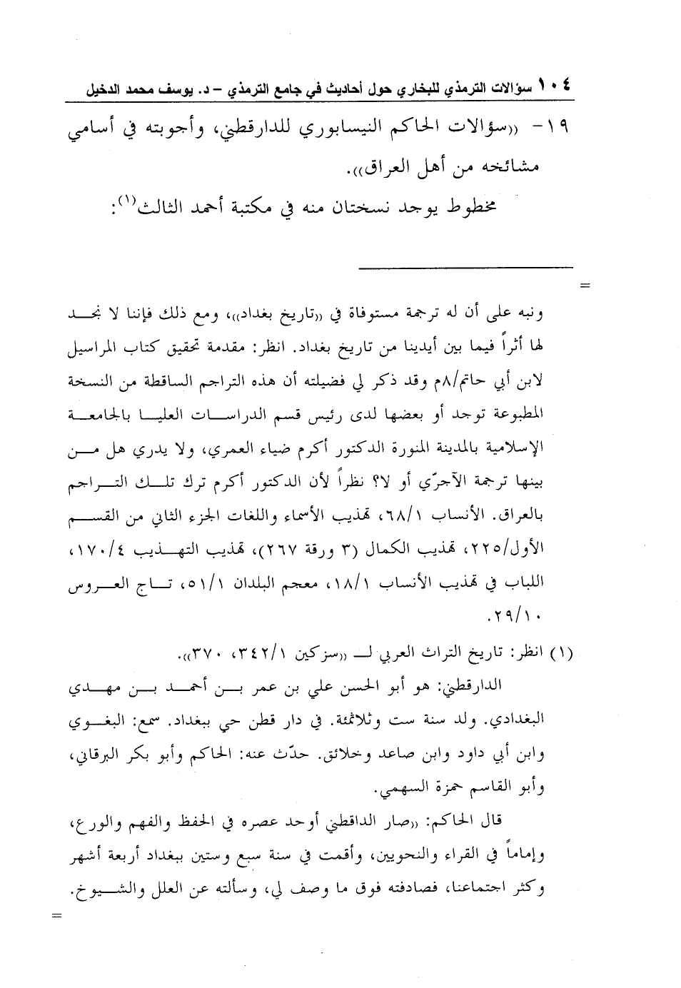 "سؤالات الحاكم النيسابوري للدارقطني، وأجوبته في أسامي مشائخه من أهل العراق".