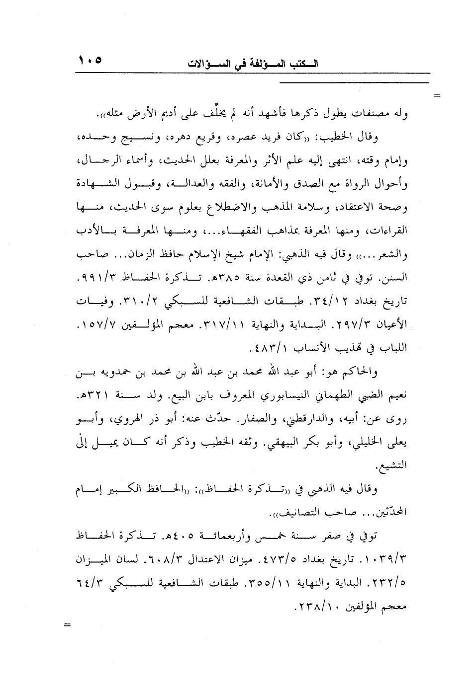 تنبيه: للحاكم أجوبة حين منصرفه من بغداد عن أسئلة أهل الحديث عن جماعة من الخراسانيين لم يقفوا على محلهم من الجرح والتعديل مخطوط في مكتبة أحمد الثالث (624/18) يقع في (10) ورقات تاريخ التراث العربي 1/370.