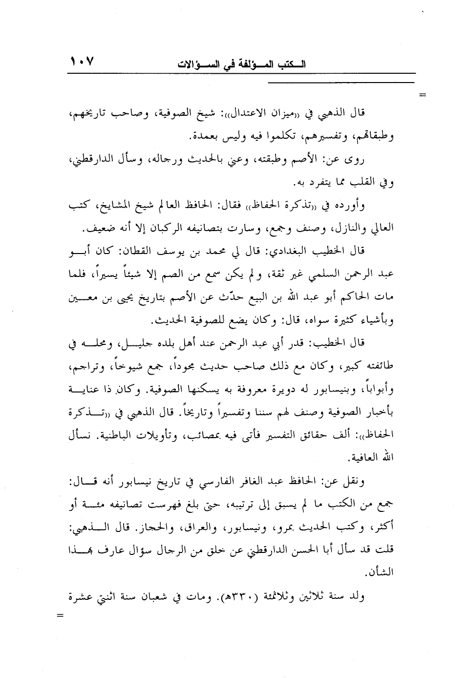 ونقل عن: الحافظ عبد الغافر الفارسي في تاريخ نيسابور أنه قال: جمع من الكتب ما لم يسبق إلى ترتيبه، حتى بلغ فهرست تصانيفه مئة أو أكثر، وكتب الحديث بمرو، ونيسابور، والعراق، والحجاز. قال الذهبي: قلت قد سأل أبا الحسن الدارقطني عن خلق من الرجال سؤال عارف بهذا الشأن.