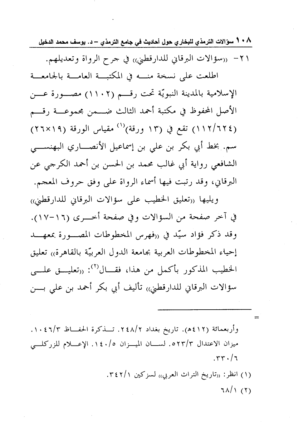 ويليها "تعليق الخطيب على سؤالات البرقاني للدارقطني" في آخر صفحة من السؤالات وفي صفحة أخرى (16-17) . وقد ذكر فؤاد سيّد في "فهرس المخطوطات المصورة بمعهد إحياء المخطوطات العربية بجامعة الدول العربيّة بالقاهرة" تعليق الخطيب المذكور بأكمل من هذا، فقال2: "تعليق على سؤالات البرقاني للدارقطني" تأليف أبي بكر أحمد بن علي بن