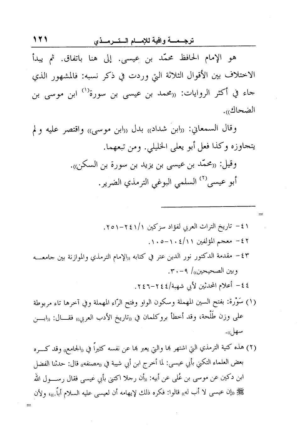 2 هذه كنية الترمذي التي اشتهر بها والتي يعبر بها عن نفسه كثيراً في "الجامع" وقد كره بعض العلماء التكني بأبي عيسى: لما أخرج ابن أبي شيبة في "مصنفه" قال: حدثنا الفضل ابن دكين عن موسى بن عُلى عن أبيه: "أن رجلا اكتنى بأبي عيسى فقال رسول الله صلى الله عليه وسلم "إن عيسى لا أب له" قالوا: فكره ذلك لإيهامه أن لعيسى عليه السلام أباً."، ولأن