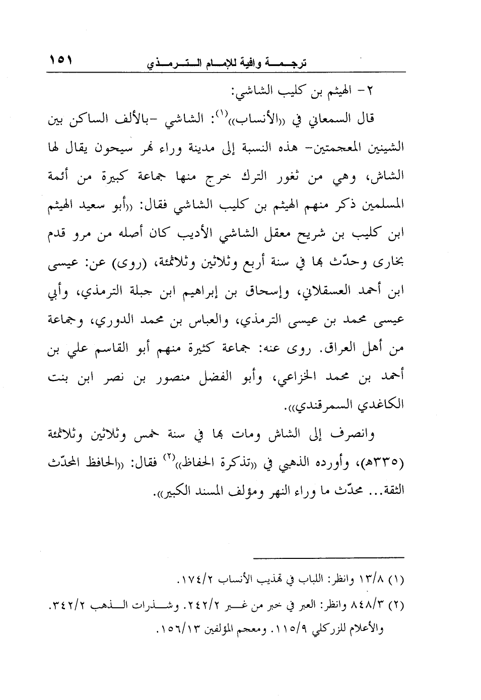وانصرف إلى الشاش ومات بها في سنة خمس وثلاثين وثلاثمئة (335?) ، وأورده الذهبي في "تذكرة الحفاظ"2 فقال: "الحافظ المحدّث الثقة ... محدّث ما وراء النهر ومؤلف المسند الكبير".