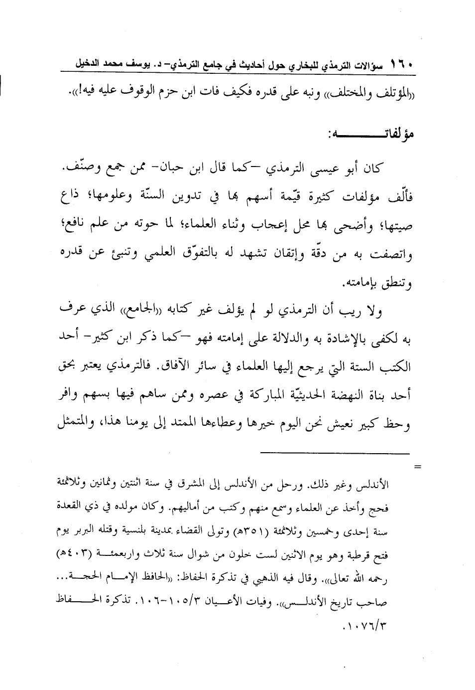 ولا ريب أن الترمذي لو لم يؤلف غير كتابه "الجامع" الذي عرف به لكفى بالإشادة به والدلالة على إمامته فهو –كما ذكر ابن كثير- أحد الكتب الستة التي يرجع إليها العلماء في سائر الآفاق. فالترمذي يعتبر بحق أحد بناة النهضة الحديثيّة المباركة في عصره وممن ساهم فيها بسهم وافر وحظ كبير نعيش نحن اليوم خيرها وعطاءها الممتد إلى يومنا هذا، والمتمثل