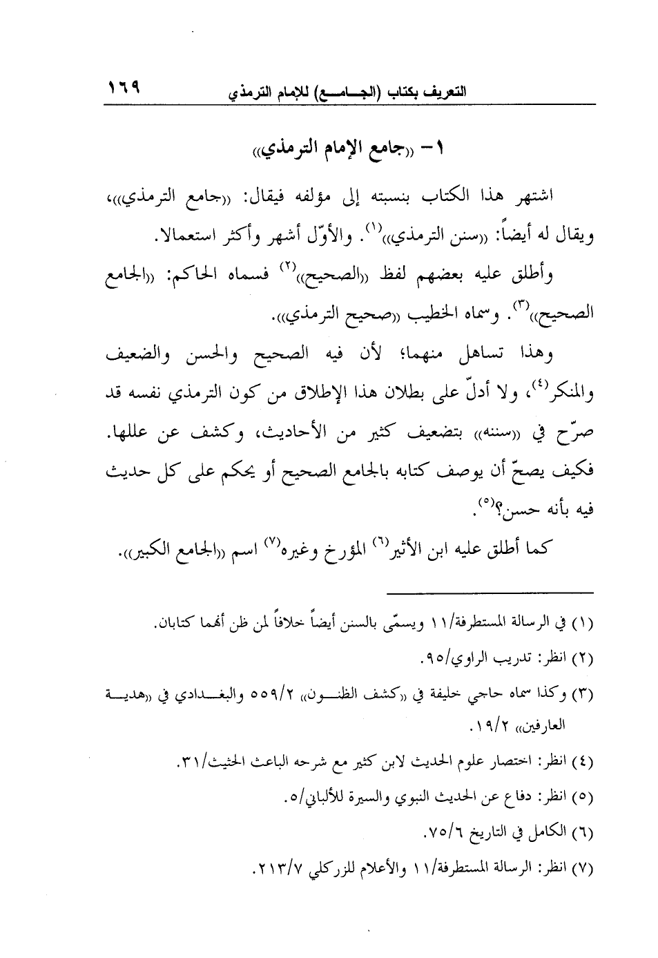 وهذا تساهل منهما؛ لأن فيه الصحيح والحسن والضعيف والمنكر4، ولا أدلّ على بطلان هذا الإطلاق من كون الترمذي نفسه قد صرّح في "سننه" بتضعيف كثير من الأحاديث، وكشف عن عللها. فكيف يصحّ أن يوصف كتابه بالجامع الصحيح أو يحكم على كل حديث فيه بأنه حسن؟ 5.