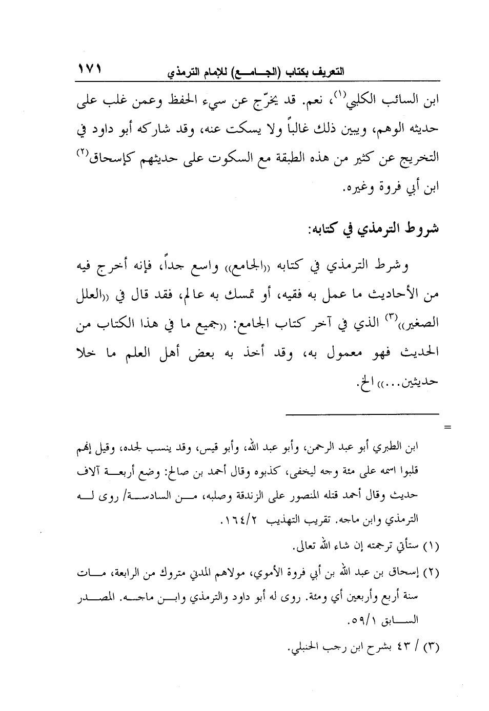 وشرط الترمذي في كتابه "الجامع" واسع جداً، فإنه أخرج فيه من الأحاديث ما عمل به فقيه، أو تمسك به عالم، فقد قال في "العلل الصغير"3 الذي في آخر كتاب الجامع: "جميع ما في هذا الكتاب من الحديث فهو معمول به، وقد أخذ به بعض أهل العلم ما خلا حديثين ... " الخ.