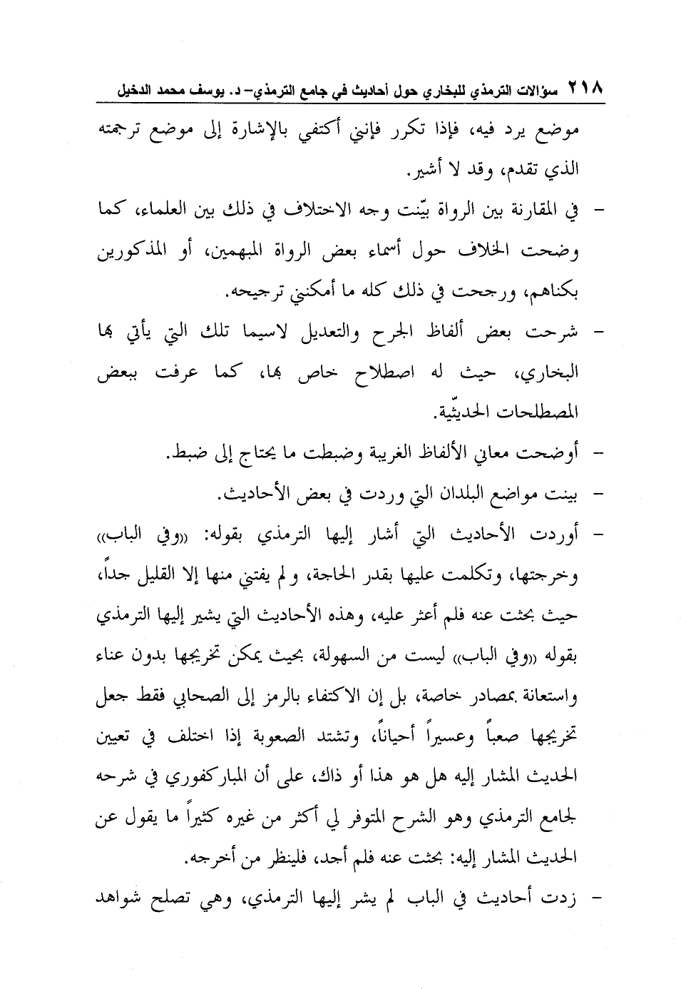 أوردت الأحاديث التي أشار إليها الترمذي بقوله: "وفي الباب" وخرجتها، وتكلمت عليها بقدر الحاجة، ولم يفتني منها إلا القليل جداً، حيث بحثت عنه فلم أعثر عليه، وهذه الأحاديث التي يشير إليها الترمذي بقوله "وفي الباب" ليست من السهولة، بحيث يمكن تخريجها بدون عناء واستعانة بمصادر خاصة، بل إن الاكتفاء بالرمز إلى الصحابي فقط جعل تخريجها صعباً وعسيراً أحياناً، وتشتد الصعوبة إذا اختلف في تعيين الحديث المشار إليه هل هو هذا أو ذاك، على أن المباركفوري في شرحه لجامع الترمذي وهو الشرح المتوفر لي أكثر من غيره كثيراً ما يقول عن الحديث المشار إليه: بحثت عنه فلم أجد، فلينظر من أخرجه.