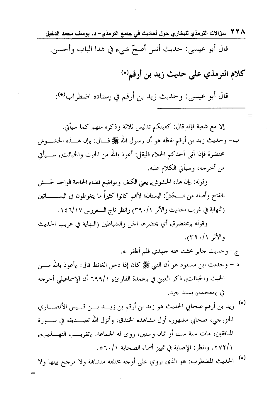 ب- وحديث زيد بن أرقم لفظه هو أن رسول الله صلى الله عليه وسلم قال: "إن هذه الحشوش محتضرة فإذا أتى أحدكم الخلاء فليقل: أعوذ بالله من الخبث والخبائث" سيأتي من أخرجه، وسيأتي الكلام عليه.