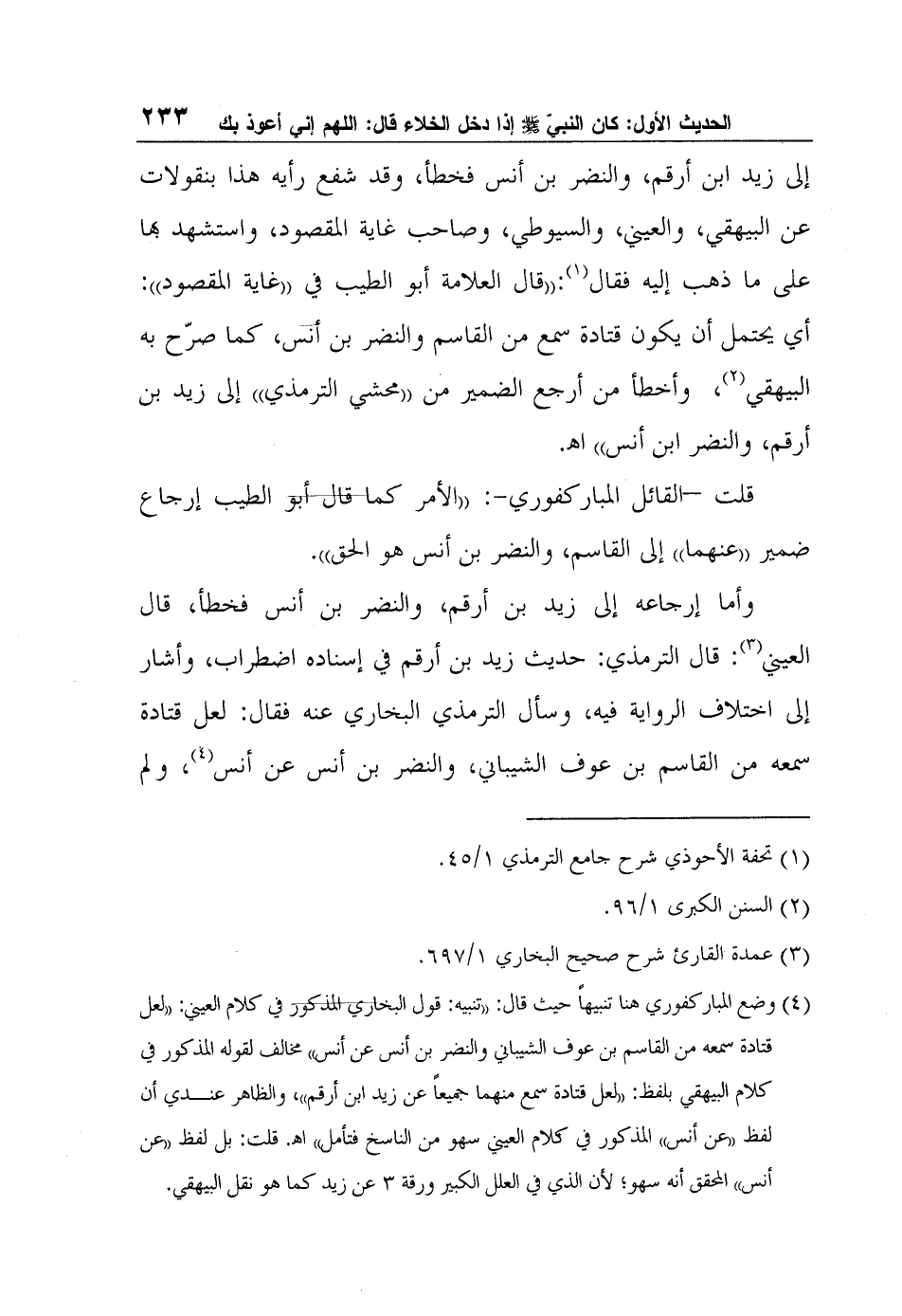 إلى زيد ابن أرقم، والنضر بن أنس فخطأ، وقد شفع رأيه هذا بنقولات عن البيهقي، والعيني، والسيوطي، وصاحب غاية المقصود، واستشهد بها على ما ذهب إليه فقال1:"قال العلامة أبو الطيب في "غاية المقصود": أي يحتمل أن يكون قتادة سمع من القاسم والنضر بن أنس، كما صرّح به البيهقي2، وأخطأ من أرجع الضمير من "محشي الترمذي" إلى زيد بن أرقم، والنضر ابن أنس" ا?.