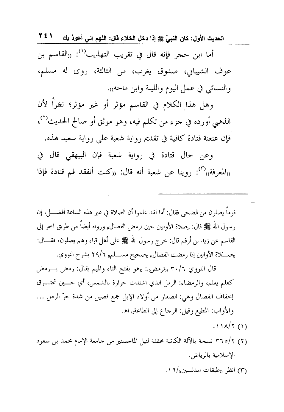وهل هذا الكلام في القاسم مؤثر أو غير مؤثر؛ نظراً لأن الذهبي أورده في جزء من تكلم فيه، وهو موثق أو صالح الحديث2، فإن عنعنة قتادة كافية في تقديم رواية شعبة على رواية سعيد هذه.