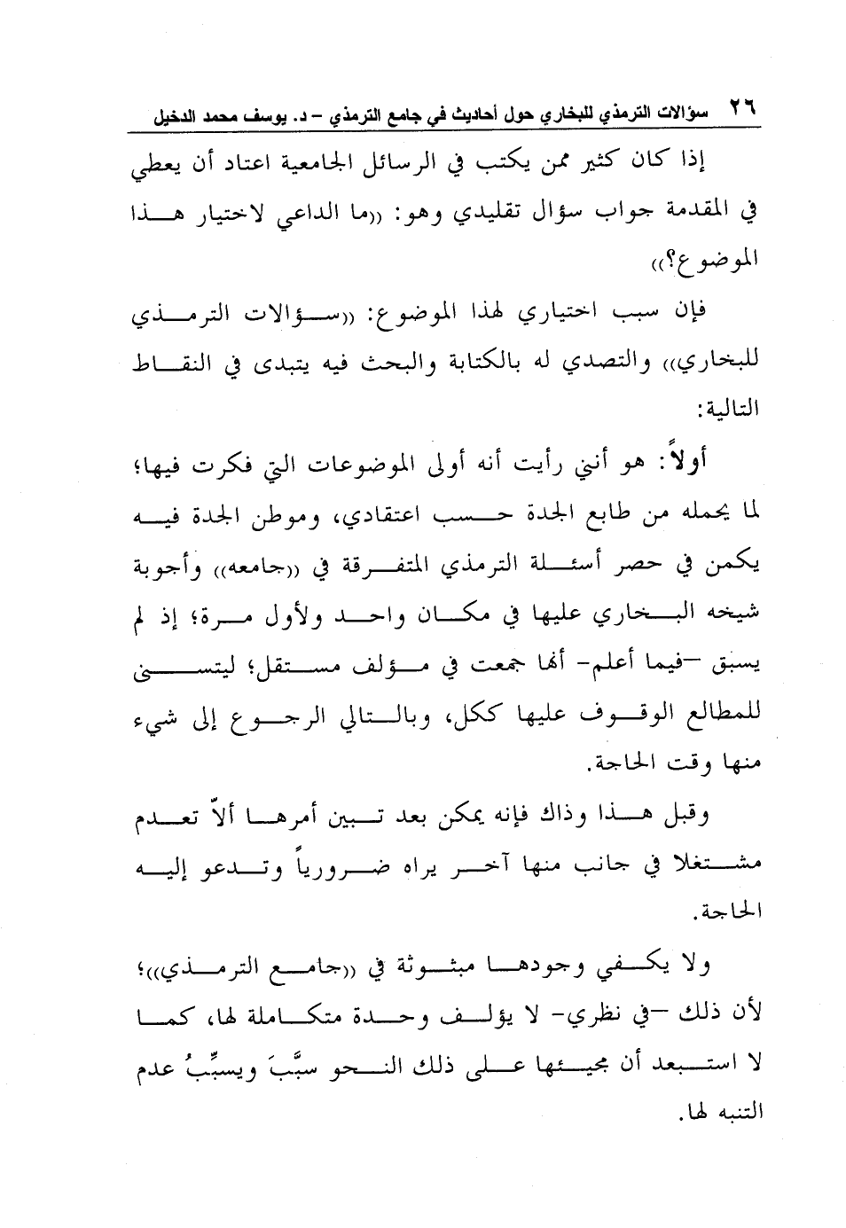 فإن سبب اختياري لهذا الموضوع: "سؤالات الترمذي للبخاري" والتصدي له بالكتابة والبحث فيه يتبدى في النقاط التالية: