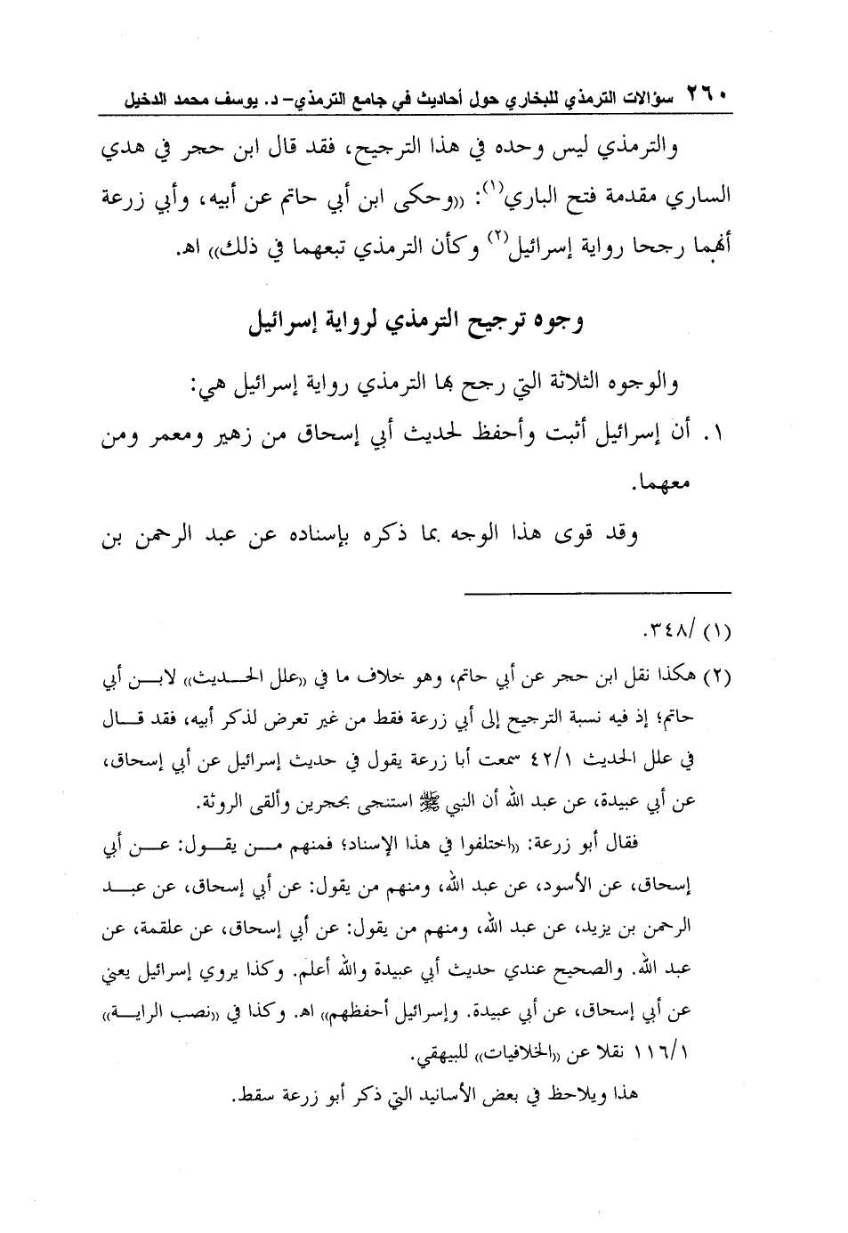 والترمذي ليس وحده في هذا الترجيح، فقد قال ابن حجر في هدي الساري مقدمة فتح الباري1: "وحكى ابن أبي حاتم عن أبيه، وأبي زرعة أنهما رجحا رواية إسرائيل2 وكأن الترمذي تبعهما في ذلك" ا?.
