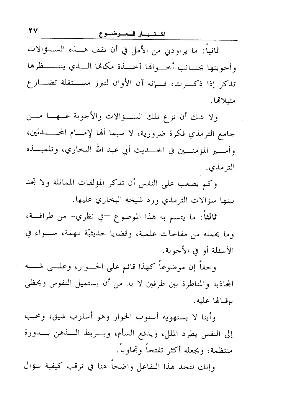 ثانياً: ما يراودني من الأمل في أن تقف هذه السؤالات وأجوبتها بجانب أخواتها آخذة مكانها الذي ينتظرها تذكر إذا ذكرت، فإنه آن الأوان لتبرز مستقلة تضارع مثيلاتها.