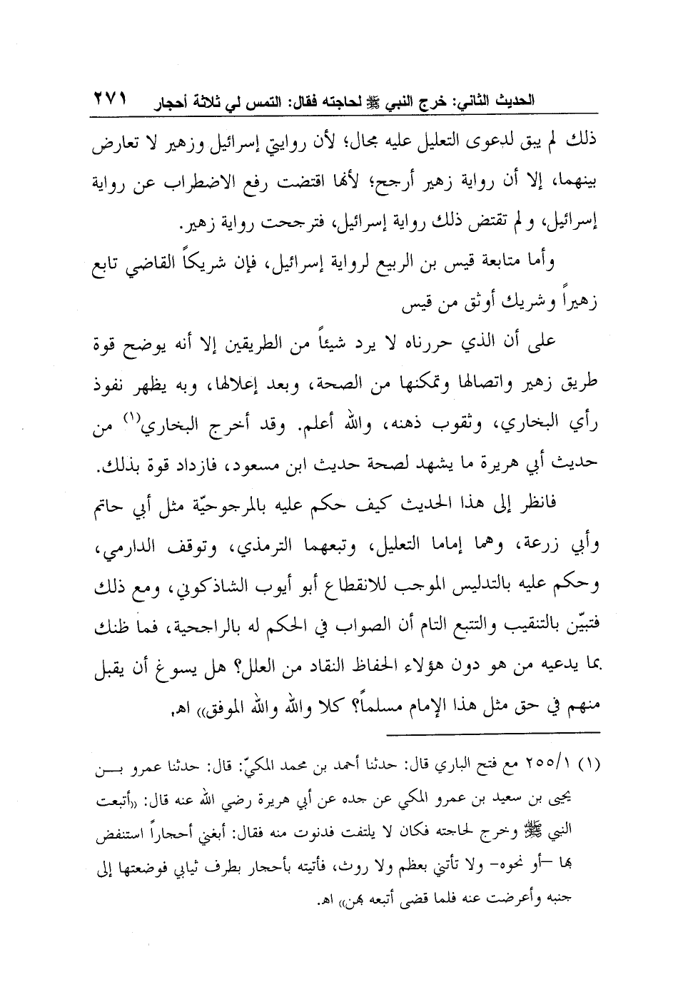 1 1/255 مع فتح الباري قال: حدثنا أحمد بن محمد المكيّ: قال: حدثنا عمرو بن يحيى بن سعيد بن عمرو المكي عن جده عن أبي هريرة رضي الله عنه قال: أتبعت النبي صلى الله عليه وسلم وخرج لحاجته فكان لا يلتفت فدنوت منه فقال: "أبغني أحجاراً استنفض بها –أو نحوه- ولا تأتني بعظم ولا روث، فأتيته بأحجار بطرف ثيابي فوضعتها إلى جنبه وأعرضت عنه فلما قضى أتبعه بهن" ا?.