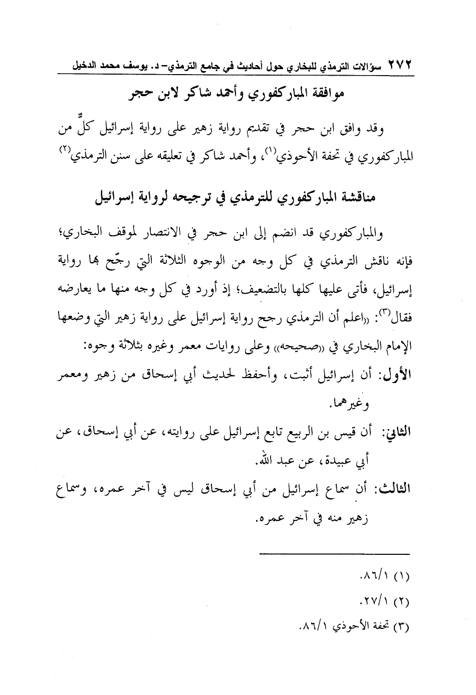والمباركفوري قد انضم إلى ابن حجر في الانتصار لموقف البخاري؛ فإنه ناقش الترمذي في كل وجه من الوجوه الثلاثة التي رجّح بها رواية إسرائيل، فأتى عليها كلها بالتضعيف؛ إذ أورد في كل وجه منها ما يعارضه فقال3: "اعلم أن الترمذي رجح رواية إسرائيل على رواية زهير التي وضعها الإمام البخاري في "صحيحه" وعلى روايات معمر وغيره بثلاثة وجوه: