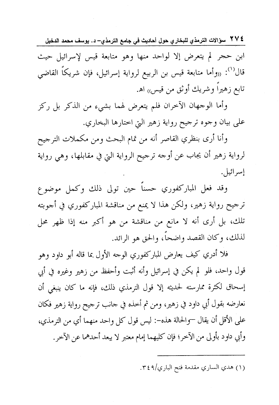 وقد فعل المباركفوري حسناً حين تولى ذلك وكمل موضوع ترجيح رواية زهير، ولكن هذا لا يمنع من مناقشة المباركفوري في أجوبته تلك، بل أرى أنه لا مانع من مناقشة من هو أكبر منه إذا ظهر محل لذلك، وكان القصد واضحاً، والحق هو الرائد.
